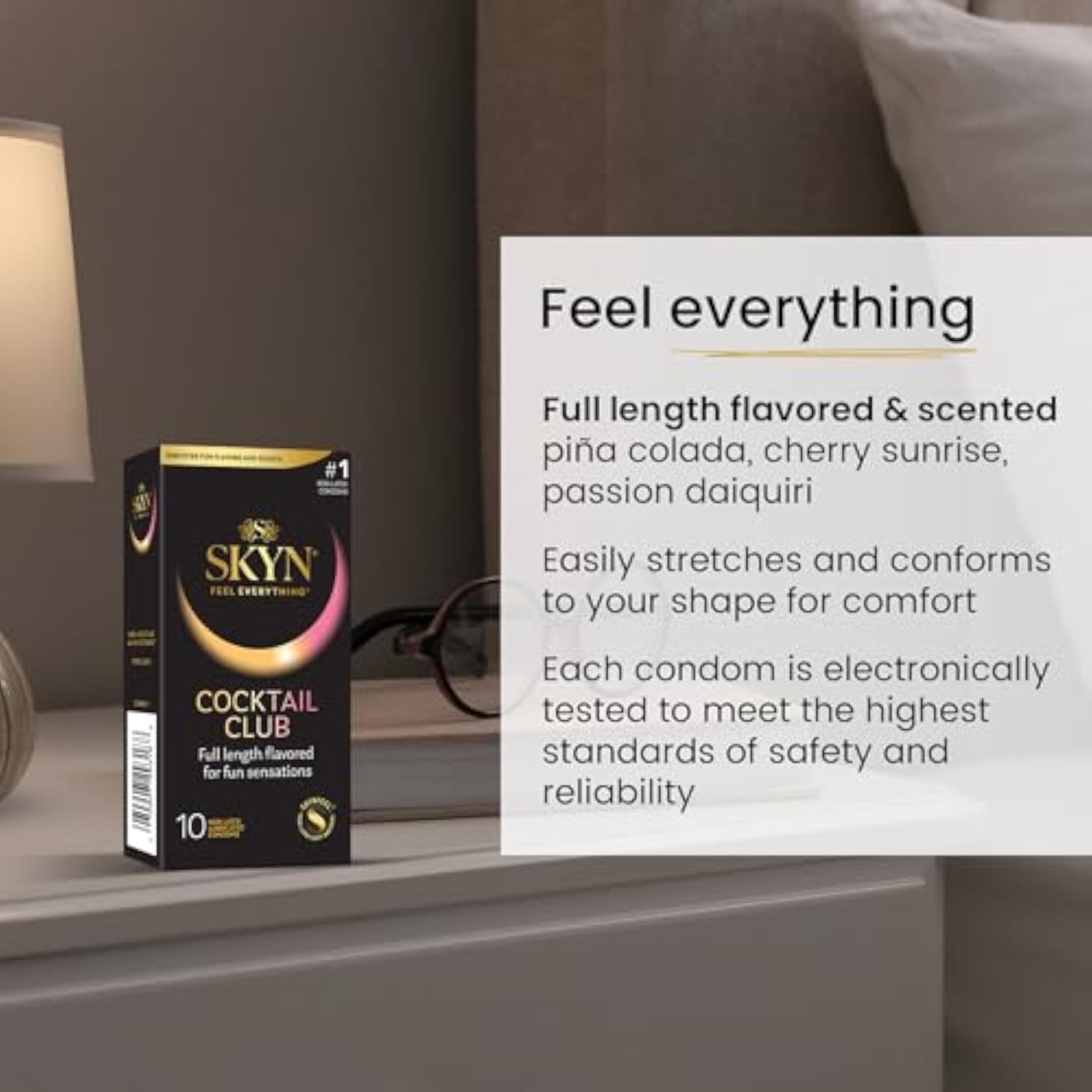 | Sensory Delight: Indulge In The Exotic Flavors Of Piña Colada, Cherry Sunrise, And Passion Daiquiri, With Cocktail Club Premium Flavored Condoms. | | Variety Of Sensations: Selection Variety Pack Features 4 Types Of Assorted Lubricated Non-Latex Condoms Including Original, Excitation, Elite, And Elite Extra Lube Condoms. | | Unparalleled Comfort: Experience The Ultimate Comfort With Feel Material, A Technologi