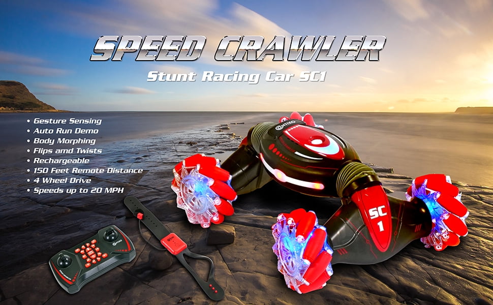 Contixo SC1 All Terrain Speed Crawler RC Stunt Car, 4WD 2.4GHz Remote Control Car Gesture Sensor Toy Cars, Double Sided Rotating Off-Road Vehicle 360° Flip with Lights Music, Kids Toy Cars, Red