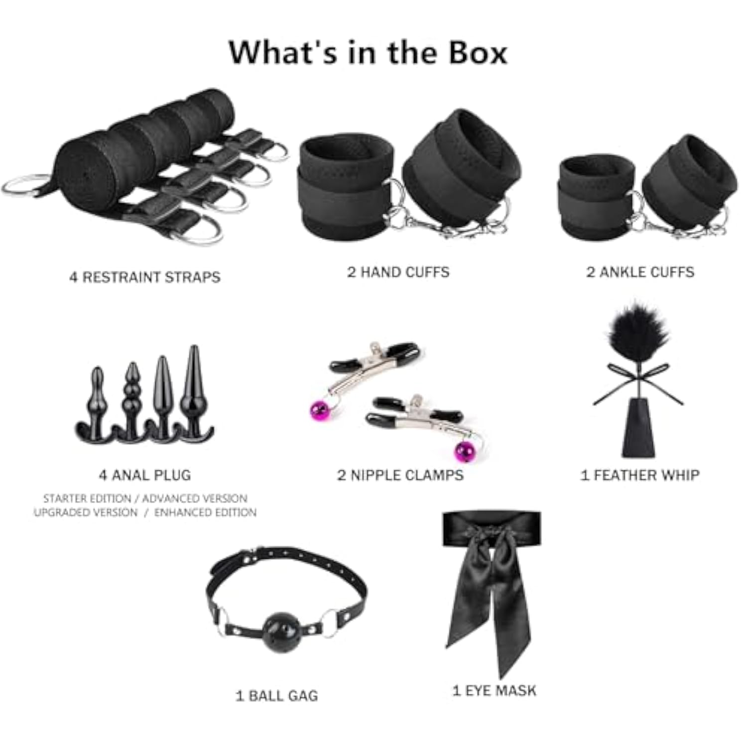 | 17 Pcs Bondage Gear Accessories Set : 4 Restraint Straps + 4 Bondage Cuffs + 4 Anal Plug + 2 Nipple Clamps + 1 Feather + 1 Whip + 1 Eye Mask, Meet All Your Sexual Needs,You Can Diy Your Favorite Style At Any Time,It Is Perfect For Beginners And Some Bondage Experience. | | Say No To An Unchanging Life ?4 Independent Sex Straps And Restraint Cuffs, Can Adapt To Most Beds And Chairs, Easy To Install, The Length Of The Sex Belt Is Adjustable, The Tightness Of The Restraint Cuffs Is Adjustable, The Tightness Of The Nipple Clamps Is Adjustable, And It Can Be Used With Whip Feathers And Eye Masks. Now Just Where You Want To Try It And Start Enjoying Your Joy | | Start Your Diy : Instead Of Simply Connecting The Cuffs To The Nylon Straps Under The Mattress, You Can Connect The Lobster Clasps Together To Form Handcuffs, Leg Shackles Or Even Hog Ties. | | Portable, Comfortable And Safe : This Bdsm Sex Toys Is Easy To Pack, You Can Put It In Your Bag, Convenient For You To Carry When You Go Out Or Travel, And Have Fun Anytime And Anywhere. We Are Made Of Soft Materials, Comfortable To Wear, Safe And Reliable | | Discreet Packaging After-Sales Support : The Adult Toys Will Come In A Discreet Box. If You Have Any Questions, Please Go To Your Order List To