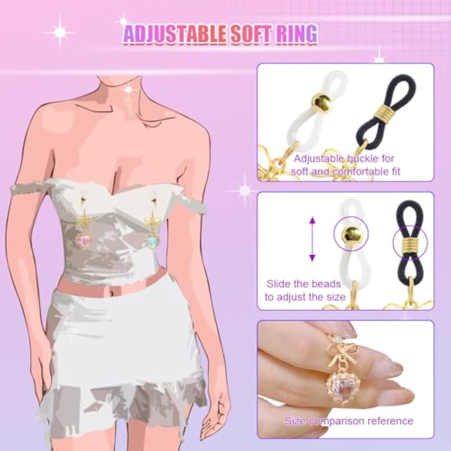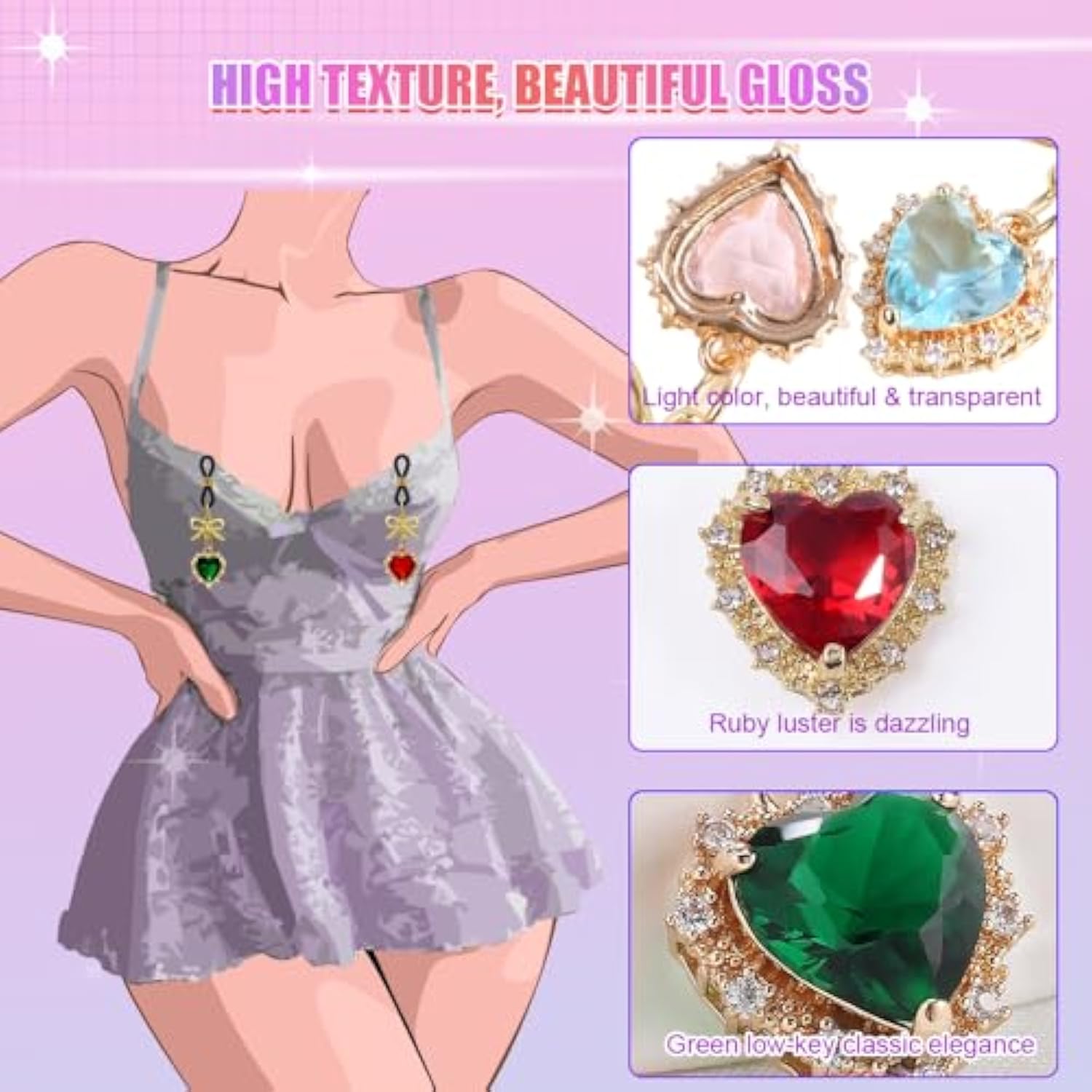 Crystal Heart Pendant Body Clamps Non-Pierce Jewelry With Bow, Red And Green Gemstones For Women Gold-Tone, 2 Pairs Adjust Tightness (2 Pairs - Pink Sapphire)