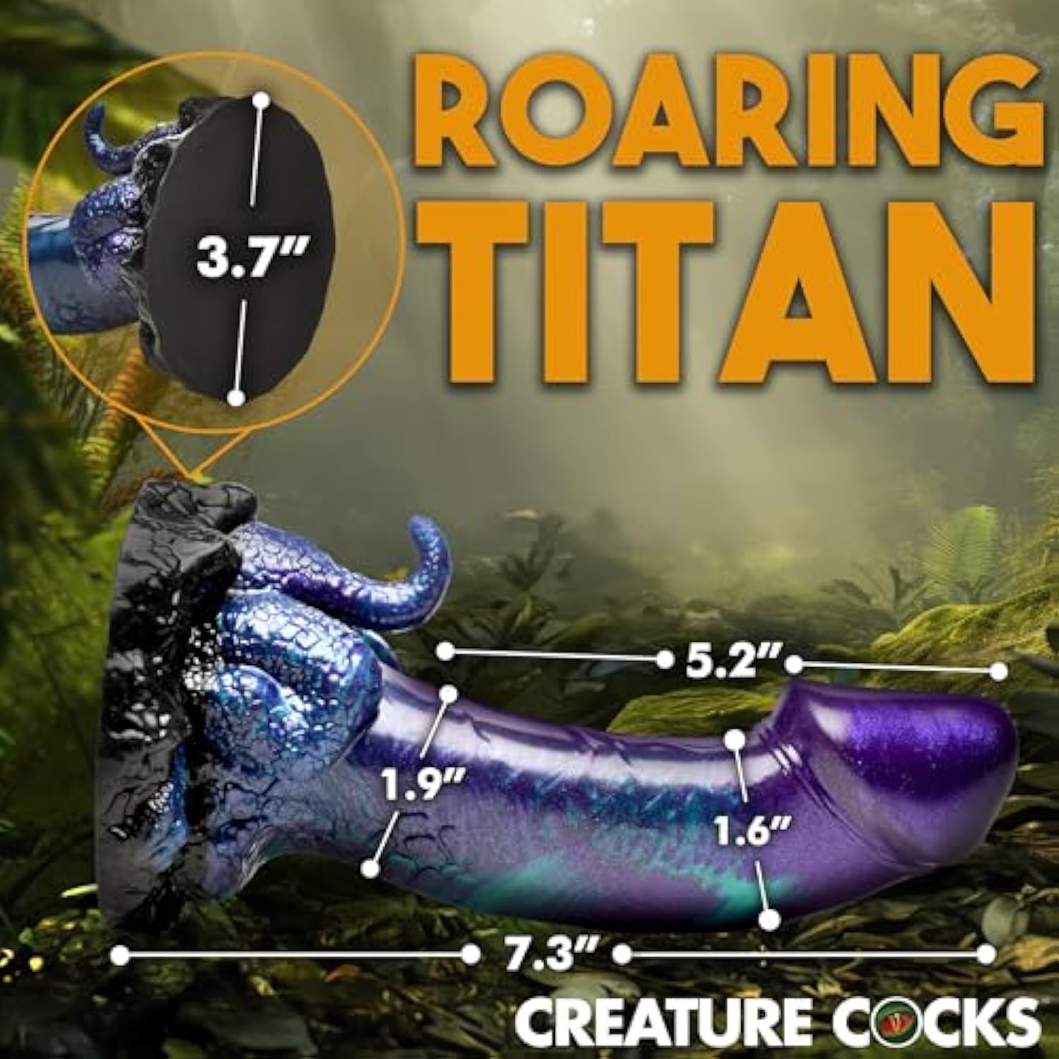 Dino-Dick Dinosaur Silicone Dildo For Men, Women, & Couples. Fantasy Dildo With Strong Suction Cup Base. Harness Compatible, Stimulating Textures, 1 Piece, Large Blue & Purple.