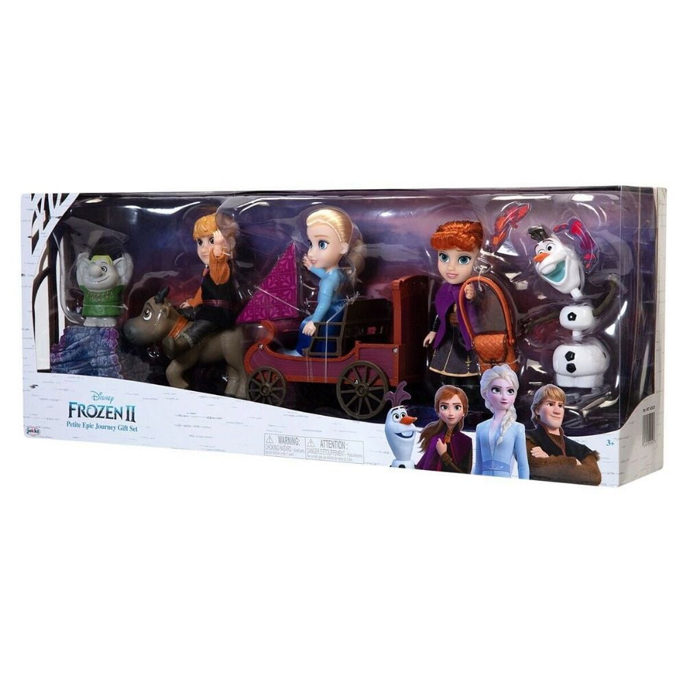 Disney Frozen II Petite Epic Journey Gift Set Anna, Elsa, Sven, Kristoff & OlafEnjoy characters from Disney Frozen 2 including Anna, Elsa, Kristoff, Olaf, Sven and Grand Pabbie the Troll.Included:Elsa Doll, Elsa Dress, Elsa Boots, Anna Doll, Anna Dress, Anna Boots, Kristoff Doll, Kristoff Shirt, Sven, Olaf, Troll, Carriage, Satchel, and ShawlFeatures:-Wagon included with rolling wheels-Dolls can be posable-Anna, Elsa, and Kristoff dolls are wearing their signature outfits from the film!-Olaf comes apart and goes back together again!-Gift set includes the iconic satchel and shawl accessories inspired by the film-Anna and Elsa dolls feature rooted hair for added play!-Dolls have 5 points of articulation and can sit in the wagon and on top of Sven-Suitable for Ages 3 and above