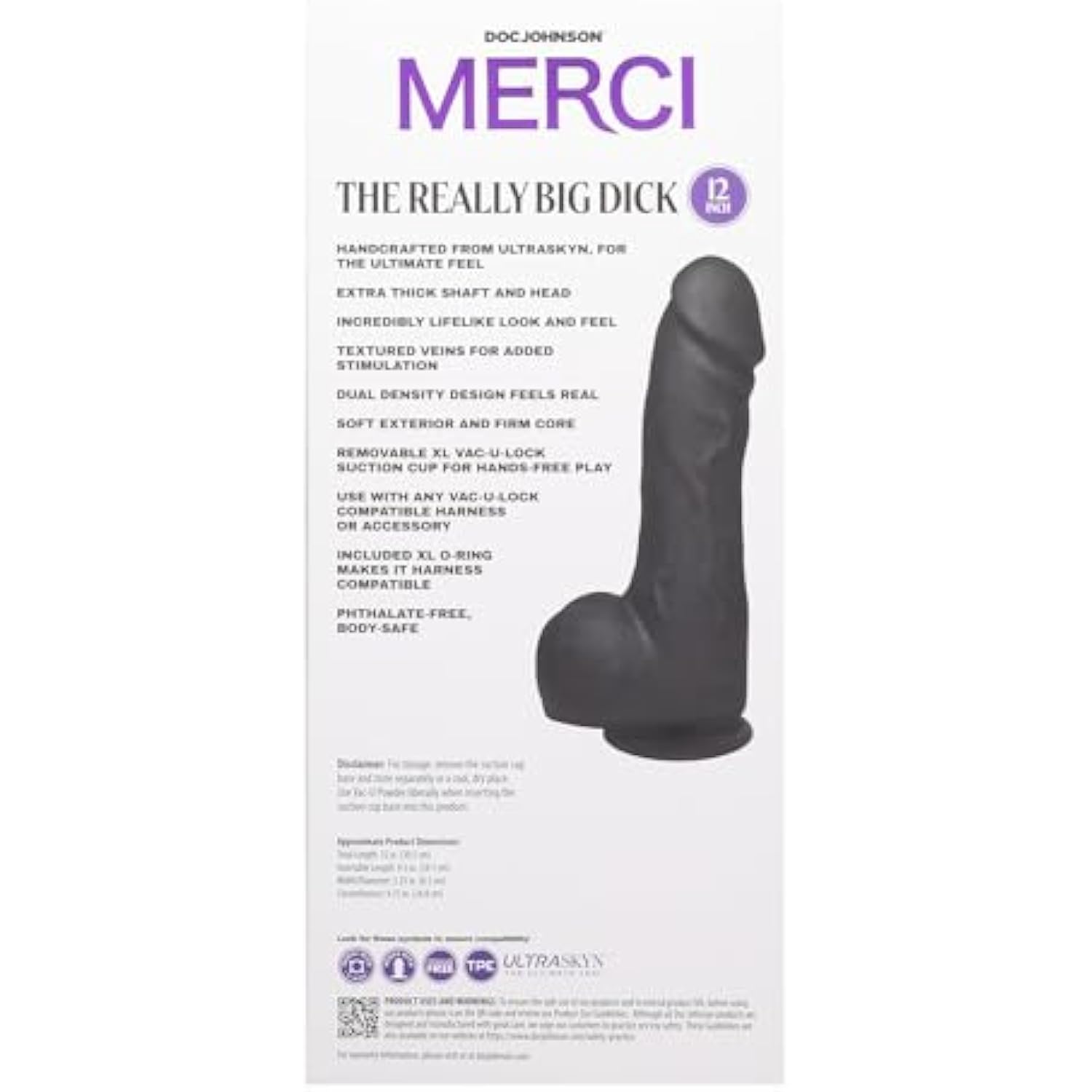 Doc Johnson Merci - The Really Big Dildo 12" - with XL Removable Vac-U-Lock Suction Cup - ULTRASKYN - for Adults Only, Black