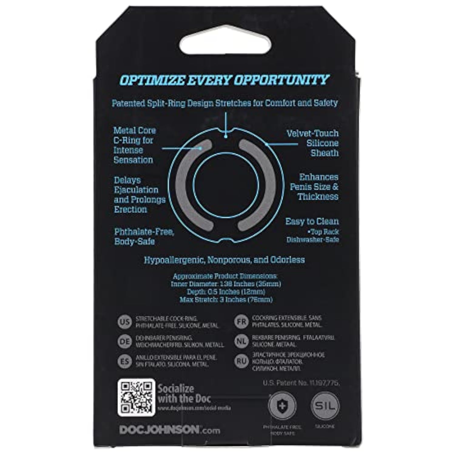 | C-Ring Dimensions: Width/Diameter: 2.5 in. (6.4 cm), Unstretched Inner Diameter: 1.38 in. (35 mm), Depth: 0.5 in. (13 mm) | | Metal C-Ring for Intense Sensation | Split-Ring Design and Velvet-Touch Silicone Sheath for Safe, Comfortable Use | | Delays Ejaculation and Prolongs Erection | Enhances Penis Size and Thickness | | Easy to Clean Top Rack Dishwasher-Safe | Nonporous, and Odorless | | Phthalate-Free, Body-Safe | |