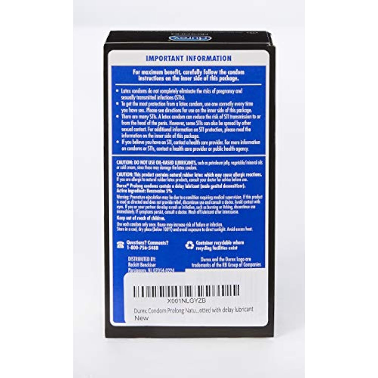 | DUREX PROLONG: Delay condoms for men are made with a desensitizing lubricant to help him last longer and are textured and designed to help speed her up | | FOR HIM: Condoms contain climax control lube on the inside made with the active ingredient: Benzocaine (5 percent) | | FOR HER: Condoms have a ribbed and dotted texture designed for added sensation and are lubricated on the outside to intensify sensation | | REGULAR FIT: Our standard girth, designed for a close and comfortable fit, with a nominal width of 56mm | | WORLD’S #1 CONDOM BRAND: Durex is the world's #1 condom brand* trusted over 80 years | | DUREX QUALITY: Each Durex condom for men is 100 percent electroni