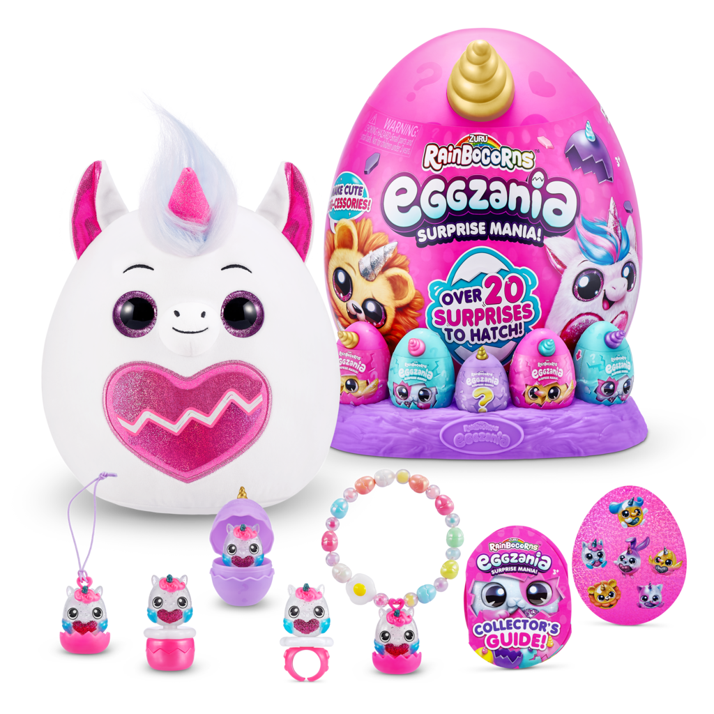Crack Into All New Eggzania! This Egg Is Oozing With Over 20 Surprises And Brand New Kooky Cute Characters. Remove The Egg From The Nest To Hatch Your Super-Squishy Eggzania Plush! There Are 6 Eggzania Animals To Collect Including Roary The Lion, Peanut The Elephant And Daffy The Flamingo! Each Eggzania Plush Comes Complete With Matching Yolkie, 5 Mini Eggs, Stickers, Wearable Accessories And An Eggzania Joke That Will Crack You Up (If You Get The Yolk)! Enter Rainboville In Style With A Ring, Stamp And Diy Bracelet That Match Your Eggzania! These Silky Soft Love To Cuddle And Will Have You Seeing Life Sunny Side Up! Which Eggzania Will You Hatch?