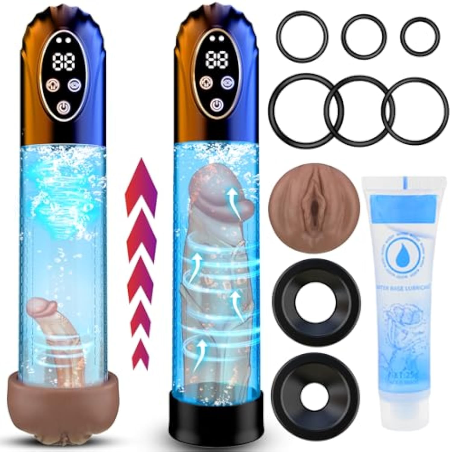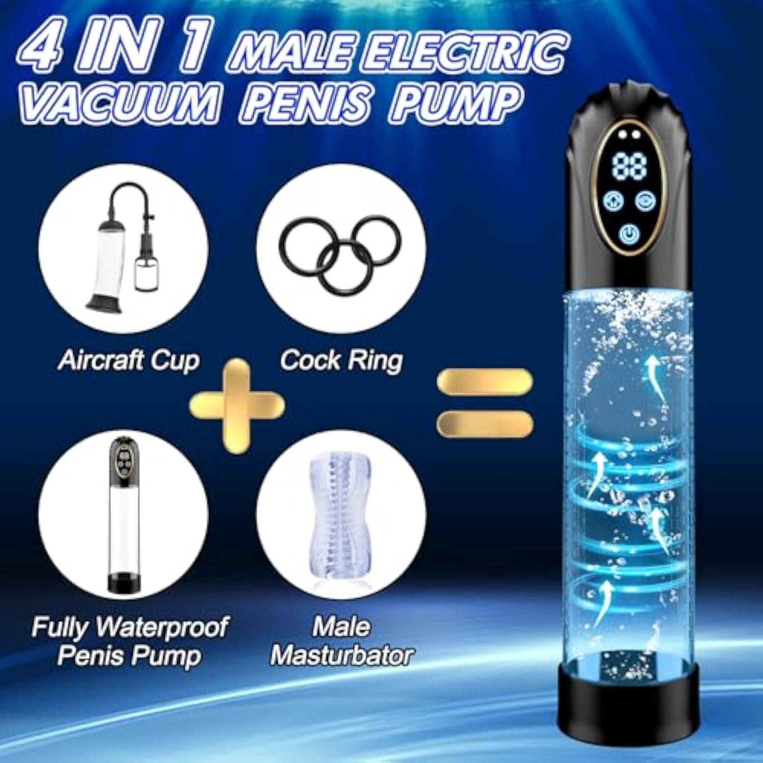 - [4 In 1 Electric Penis Pump Sex Toy] This Male Penis Enlarger Combines A Male Masturbator, Water Massage Cup, Penis Ring And Aircraft Cup In One. The Rhythmic Negative Pressure Make The Penis Expand, Causing The Blood Vessels In The Corpus Cavernosum To