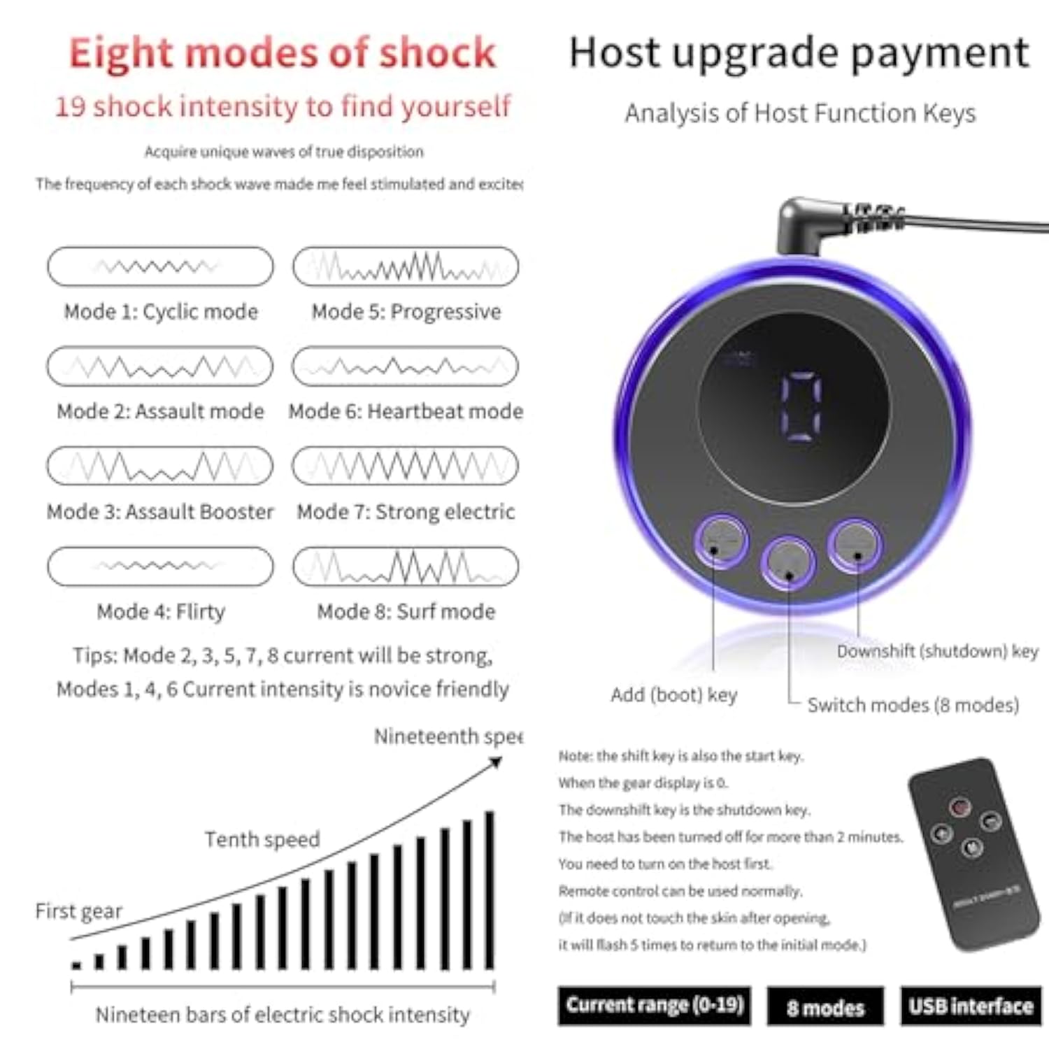 | Advanced Electric Shock Stimulation – This Electric Shock Chastity Device Delivers Rhythmic, Steady Pulses Through A Conductive Penis Ring, Enhancing Pleasure And Sensation While Maintaining Comfort. | | 8 Modes 19 Intensity Levels – Customize Your Experience With Eight Distinct Electro-Stimulation Patterns And 19 Intensity Levels, Ranging From Gentle Tingling To Deep, Rhythmic Pulsation For Maximum Pleasure. | | Remote-Controlled Pleasure – Take Control Or Hand Over The Remote To Your Partner For An Immersive Experience. This Estim Sex Product Enhances Intimacy And Adds Excitement To Your Playtime. | | Boosts Circulation Sensitivity – Electro-Stimulation Promotes Muscle Activity And Blood Flow, Making It An Ideal Choice For Those Looking To Heighten Sensitivity And Achieve Intense Pleasure. | | Perfect For Bondage Chastity Play – Designed For Both Solo Use And Couples, This Electro Sex Toy Brings An Exhilarating Mix Of Pain And Pleasure, Making It A Must-Have In Any Male Bondage Collection. | |