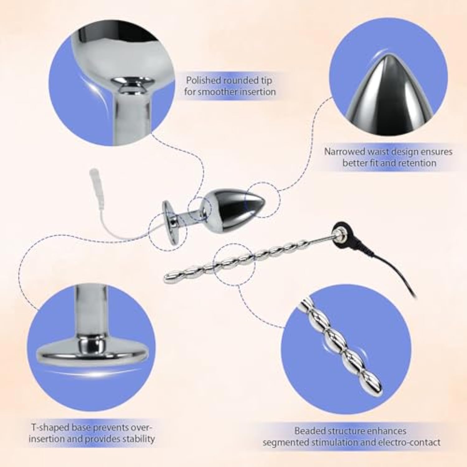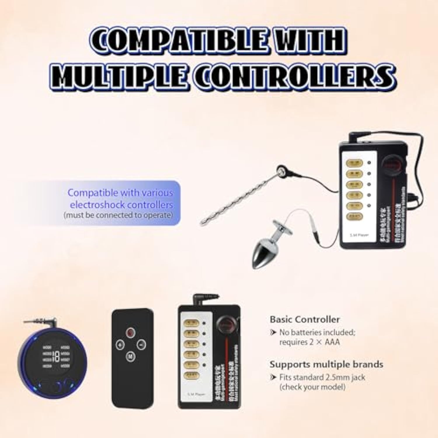 | Stainless Steel Material, Smooth And Easy To Clean:Made From Premium Stainless Steel, Smooth Surface, Easy To Clean, And Durable. Ideal For Repeated Use As A Buttplug Or Anal Trainer. | | Dual Output Electro Controller, Adjustable Intensity:Features Dual Output Ports For Various Electro Products, Adjustable Electric Shock Intensity, Multiple Modes, And Easy Operation For Versatile Use. | | Multiple Size Options To Suit Different Needs:Available In Small (28Mm 50G), Medium (33Mm 90G), And Large (43Mm 160G), Perfect As A Prostate Massager Or Analplug. | | Compatible With Hot And Cold Play:Supports Hot And Cold Play, Cool In Ice Water For Summer Or Warm In Hot Water For Winter. Suitable For Urethral Sounds And Sounding Rods. | | Compatible With Various Male Sex Toys, Easy To Operate:The Controller Works With Urethra Plugs, Penis Catheters, Buttplugs, And Other Male Sex Toys. Simple Buttons And Easy Intensity Adjustment. | |