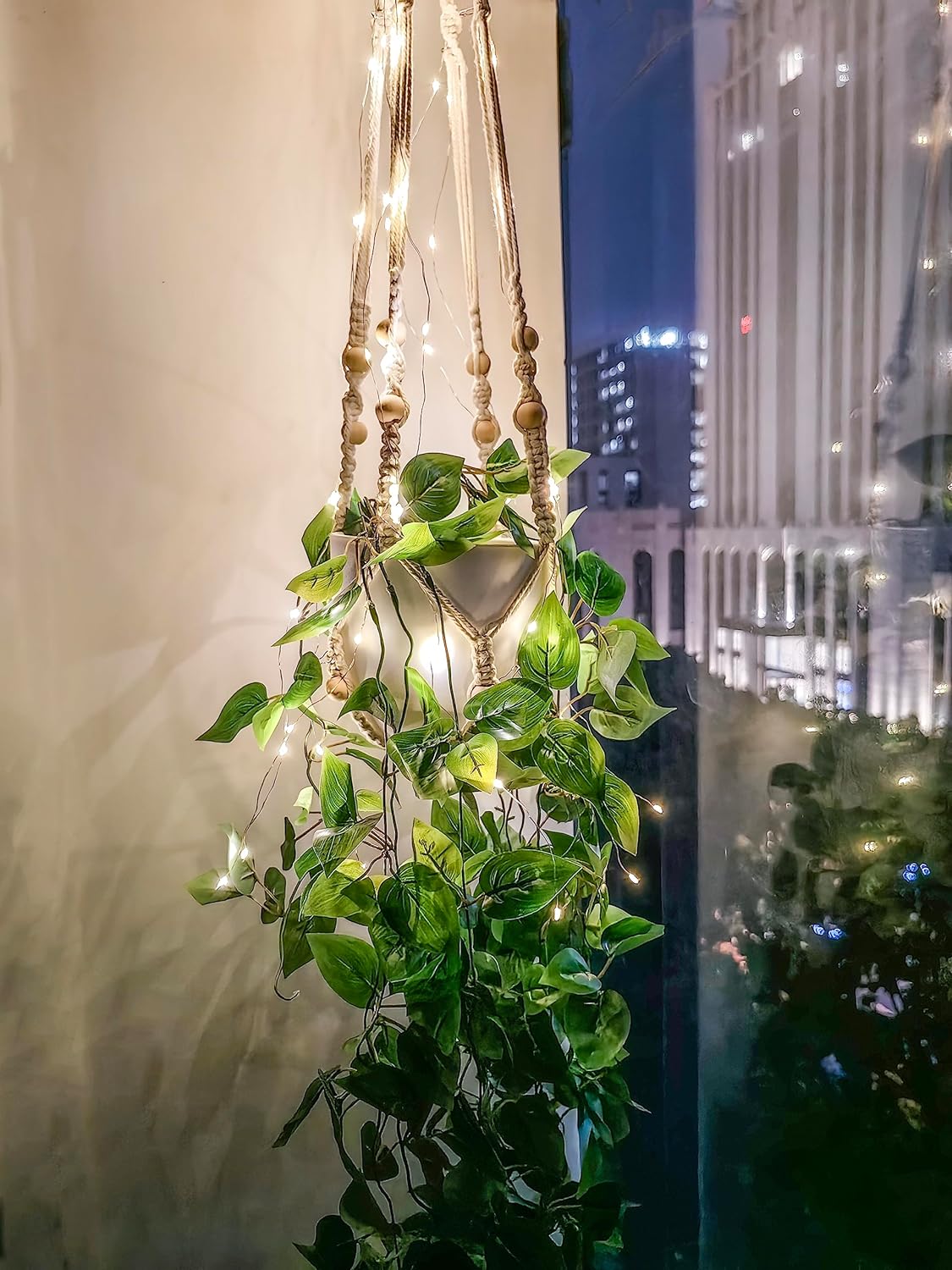 - [🌿 Attractive Greenery Decor] Macrame plant hanger with artificial hanging vines are highly realistic, suittable for celling, bedroom, living room, bathroom, office home indoor outdoor decor to be nature feel. Lifelike green plants with lights are the best choice for living space boho decoration.