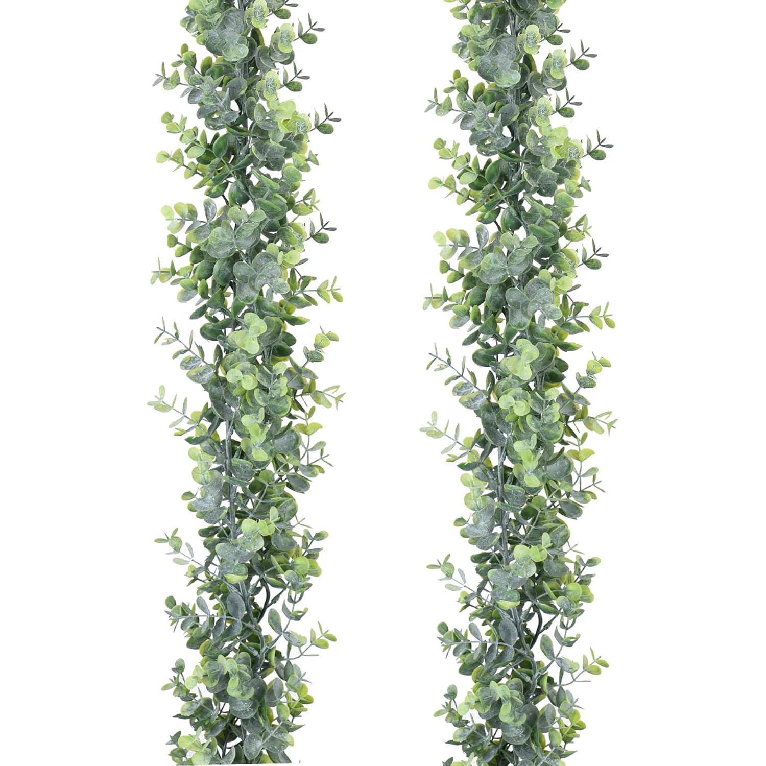 - Size:Each Artificial eucalyptus Leaves Garland is appr. 6 Ft in length /Each. Material:plastic.Color: Green,Light dusting.Especially suitable for Outdoors,Under the sun,Window,Wedding arch,Wedding background,Table.