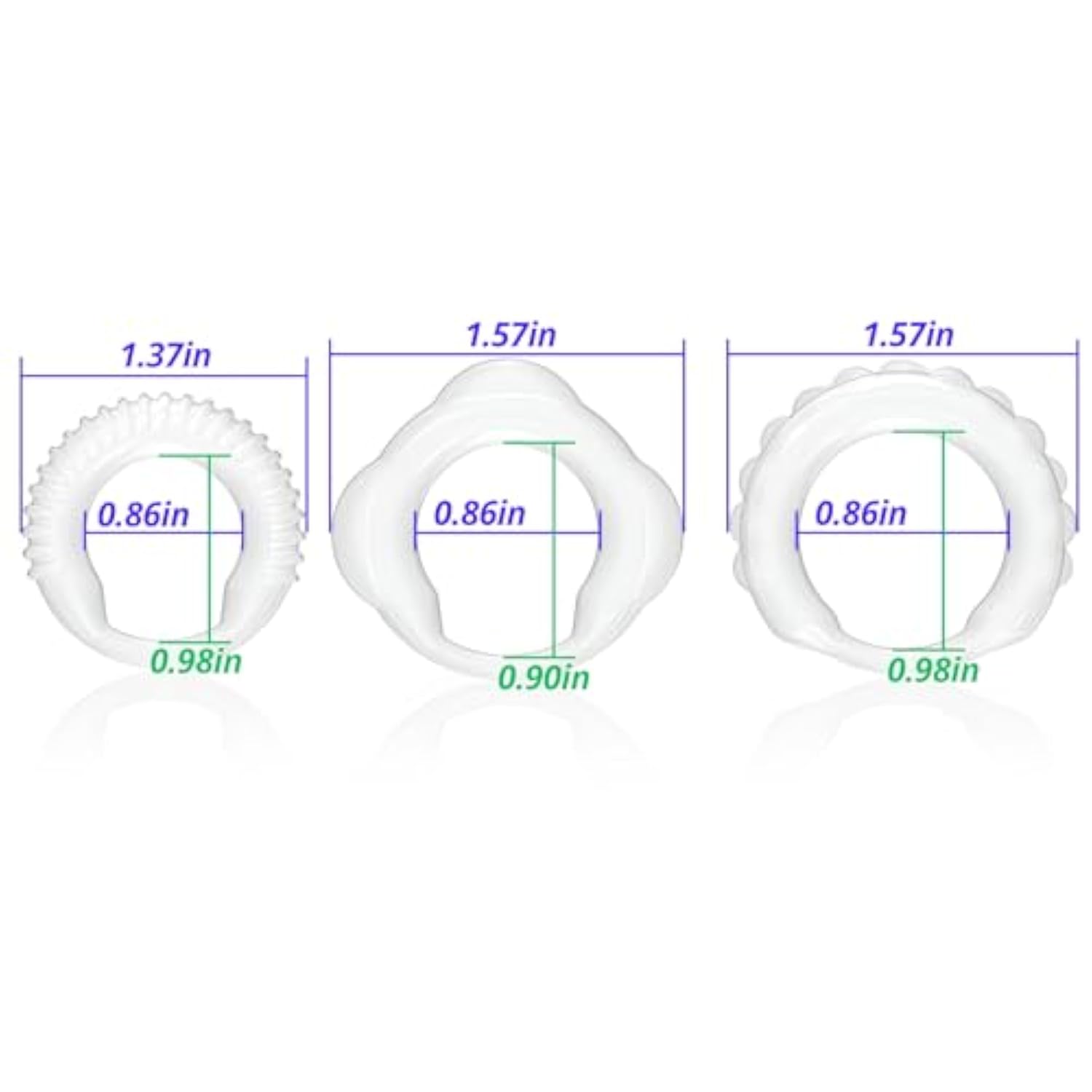 | Different Sizes: 3 Pcs Cock Rings Are Different Sizes To Meet Most People'S Body Type Requirements. And Each Size Has A Different Degree Of Elasticity, Which Can Provide Different Pressure On The Penis And Bring Different Pleasure | | Multiple Ways Of Wearing: Choose The Way Of Wearing The Cock Ring That Gives You The Most Excitement And Have Fun! The Cock Ring Set Is Available In A Variety Of Different Combinations. You Can Wear Just A Single Cock Ring Or Multiple Cock Rings On Your Penis, Or Wear Separate 3 Cock Rings On Your Glans, Root Or Testicles | | Different Shapes: The 3 Mens Cock Rings Have Different Shapes, When You Wear Them, The Different Shapes Can Bring Different Stimulation Feelings To Your Lover, Enhancing Your And Your Lover Pleasure Experience And Enriching Sexual Pleasure | | Bigger, Stronger, Longer: The Penis Ring Slows Down The Blood Flow, Making Your Penis Harder And Bigger, Erections Last Longer, Making Orgasms Last Longer And Couples Sex Better | | Hiigh Quality Material: Tpe Is Waterproof And Easy To Clean And Maintain Afterwards. Also, Compared To Metal Penis Rings, Tpe Penis Rings Are Flexible And Equally Smooth, Making Them Very Easy To Wear | |