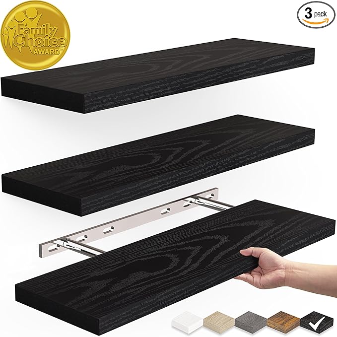 Floating Shelves for Wall, Wall Mounted Rustic Wood Shelves for Bathroom, Bedroom, Living Room, Kitchen, Hanging Shelf for Books/Storage/Room Decor with 22lbs Capacity (Black, Set of 3, 15.7in)