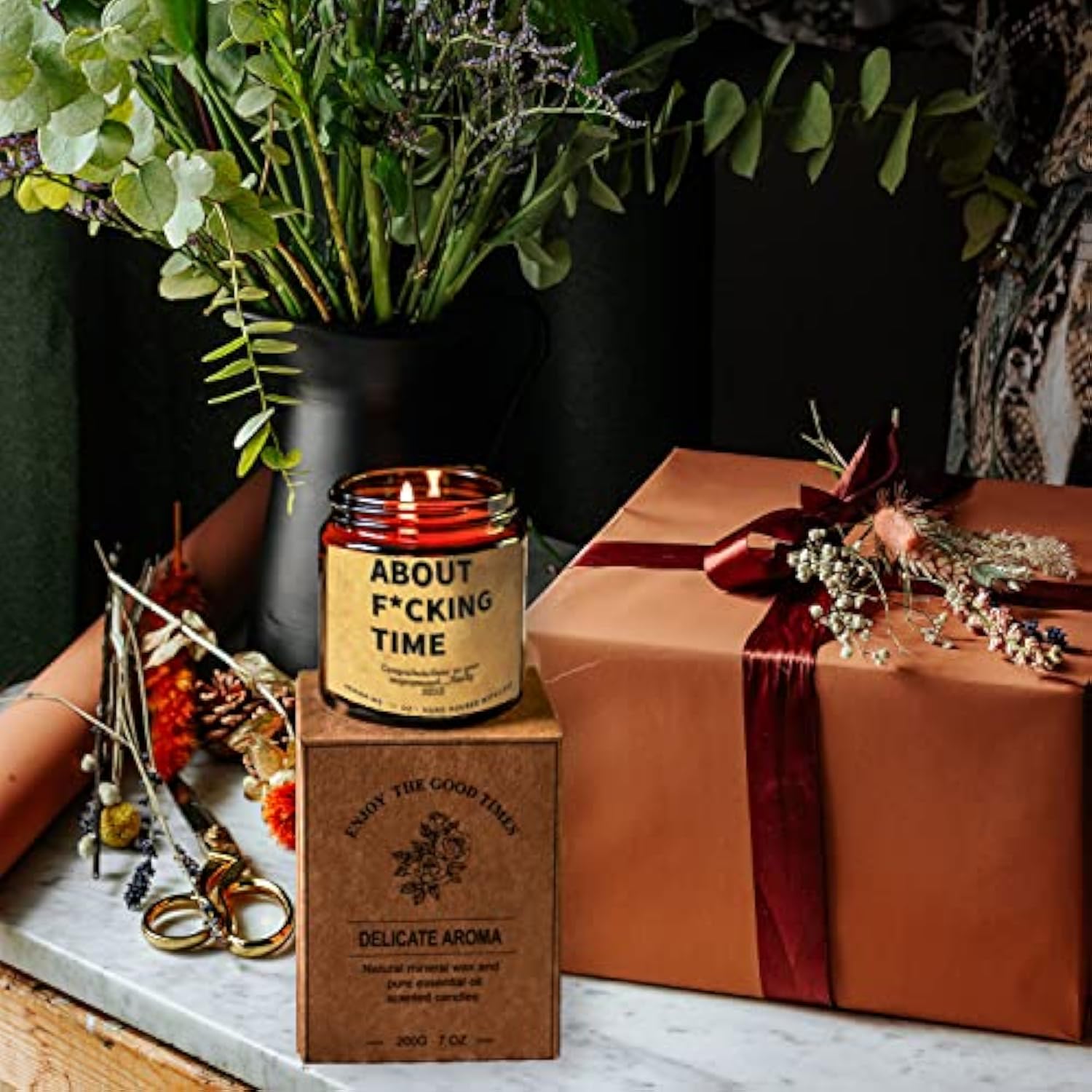 Funny Engagement Scented Candles Relaxing Lavender for Couples, New Weds (About Fucking TIME, 7 OZ / 200 Gram)