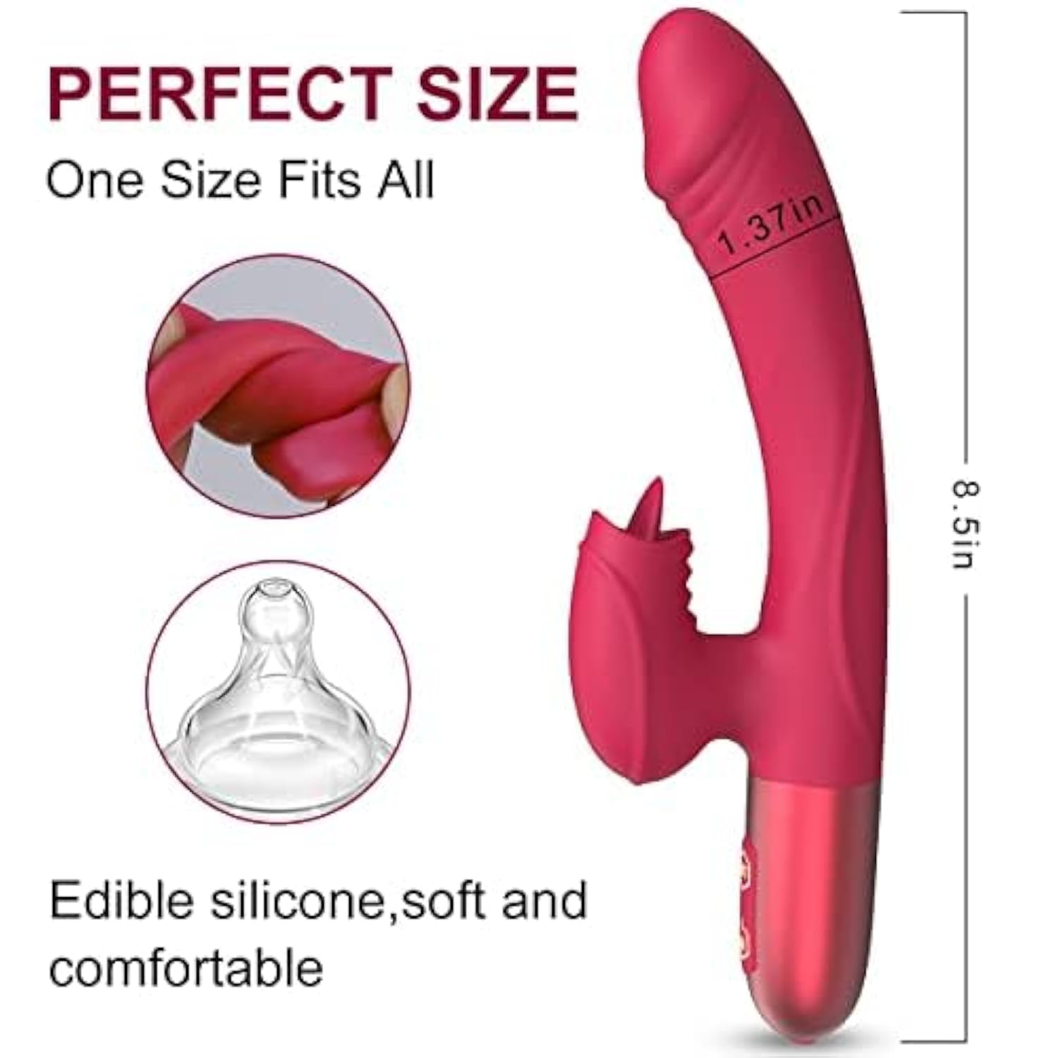 | ?Sweet Soft Tongue Licking + Powerful Vibration?This 2-In-1 Rabbit Vibrator Combines The Intense Pleasure Of Vaginal Intercourse With Soft Sweet Tongue Licking For External Clitoral Stimulation. Experience The Thrill Of Double Intercourse, Continuously Stimulating The G-Spot Layer By Layer, So That You Can'T Help Squirting And Blooming Flower Buds. | | ?Realistic Design?This Dildo Has 7 Adjustable Vibration Modes, The Curved Handle With A Textured Shaft Design, That Are More Realistic Than You'Ll Find On Other Rabbits Vibrators?Every Insertion Will Provide An Unparalleled Extra Stimulation Experience That Will Make You Forget About Him Completely. | | ?Soft Tongue Licking Function?3 Adjustable Licking Methods Can Stimulate The Clitoris Or Nipples, The Moderately Soft Tongue Will Lick Your Clitoris, Nipples, Vagina And Other Sensitive Parts From Gentle To Wild, Giving You Itching And Charming Wet Pleasure. | | ?Easy To Clean Usb Rechargeable?The Vibrator Dildo Is Made Of Hygienic Silicone. The Clitoral Vibrator Is Waterproof, So You Don'T Have To Worry About Cleaning The Toy With Tap Water. Usb Portable Charger,You Can Easily Charge The Toy With Computer Or Power Bank Using The Included Usb Cable. The Sound Will Not Exceed 50 Decibels. | | ?Discreet Packaging And After-Sales Service?This Rabbits Tongue Licking Vibrator Comes In Private Packaging.We Value Our