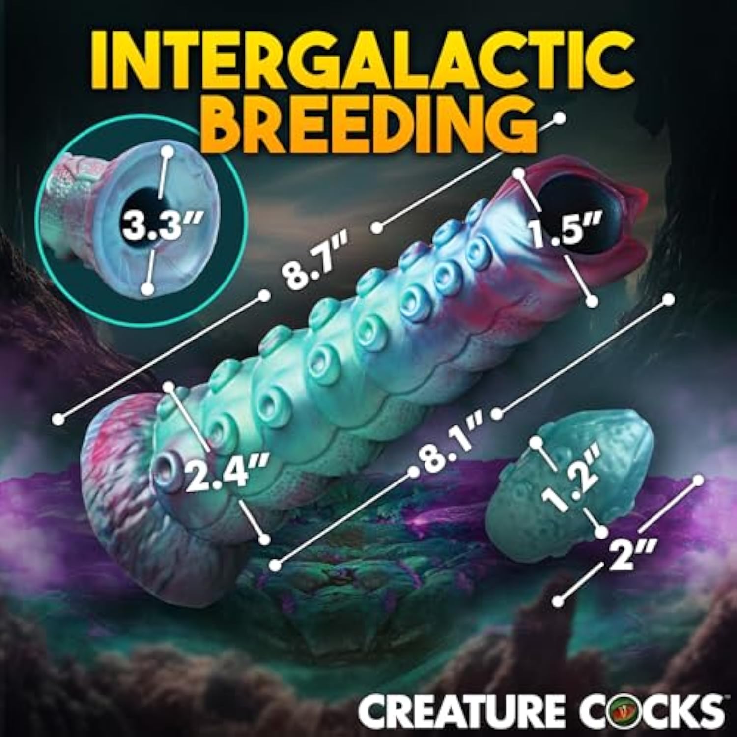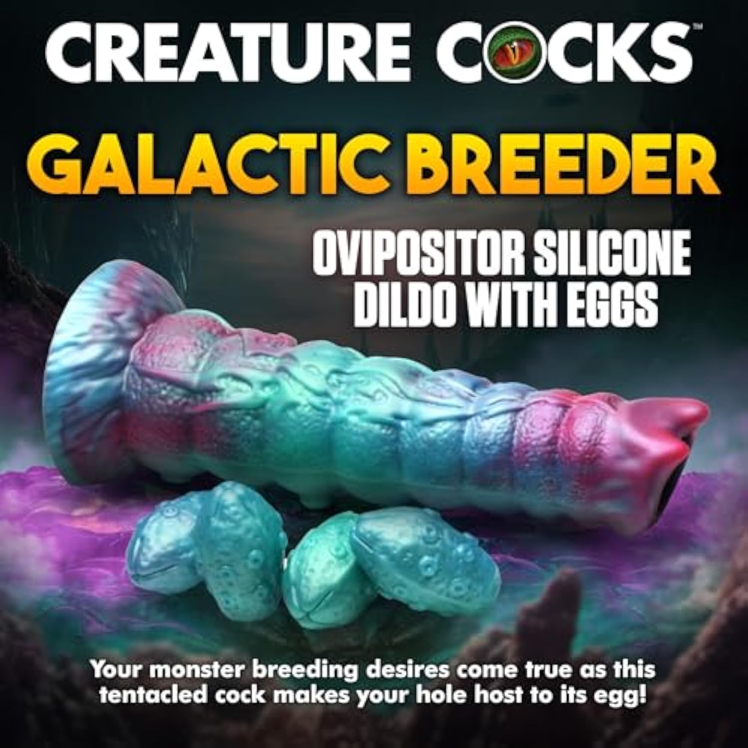 | Fantasy Ovipositor Dildo: This Gorgeous Teal, Blue And Red Ovipositor Has An Alien Symbol On One Side, Unique Texture Along The Segmented, Bulging Shaft, And An Open-Mouthed Head For 4 Squishy Eggs To Come Out Of! | | Suction Cup Base: Enjoy The Wide, Suction Cup Base Of This Dildo. Simply Press Firmly On Any Flat Surface And Enjoy Riding It Hands-Free! | | Harness Compatible: The Wide, Flanged Base Is Compatible With Most Strap-On Harnesses So You Can Wear It And Play The Fantasy Roleplay Character You Come Up With! | | Premium Silicone: Made Of Body-Safe, Phthalate-Free, Premium Silicone, It Is Best Used With Water-Based Lubricants Only. | | Measurements: Overall Length: 8.7 Inches. Insertable Length: 8.1 Inches. Narrowest Insertable Diameter: 1.5 Inches. Widest Insertable Diameter: 2.4 Inches. Eggs Are 2 Inches X 1.2 Inches. | |