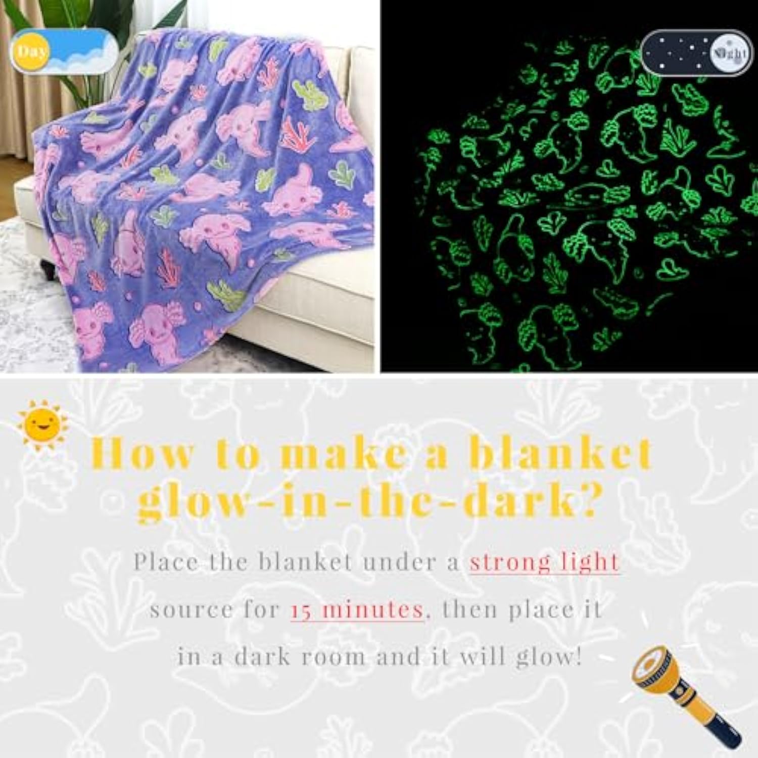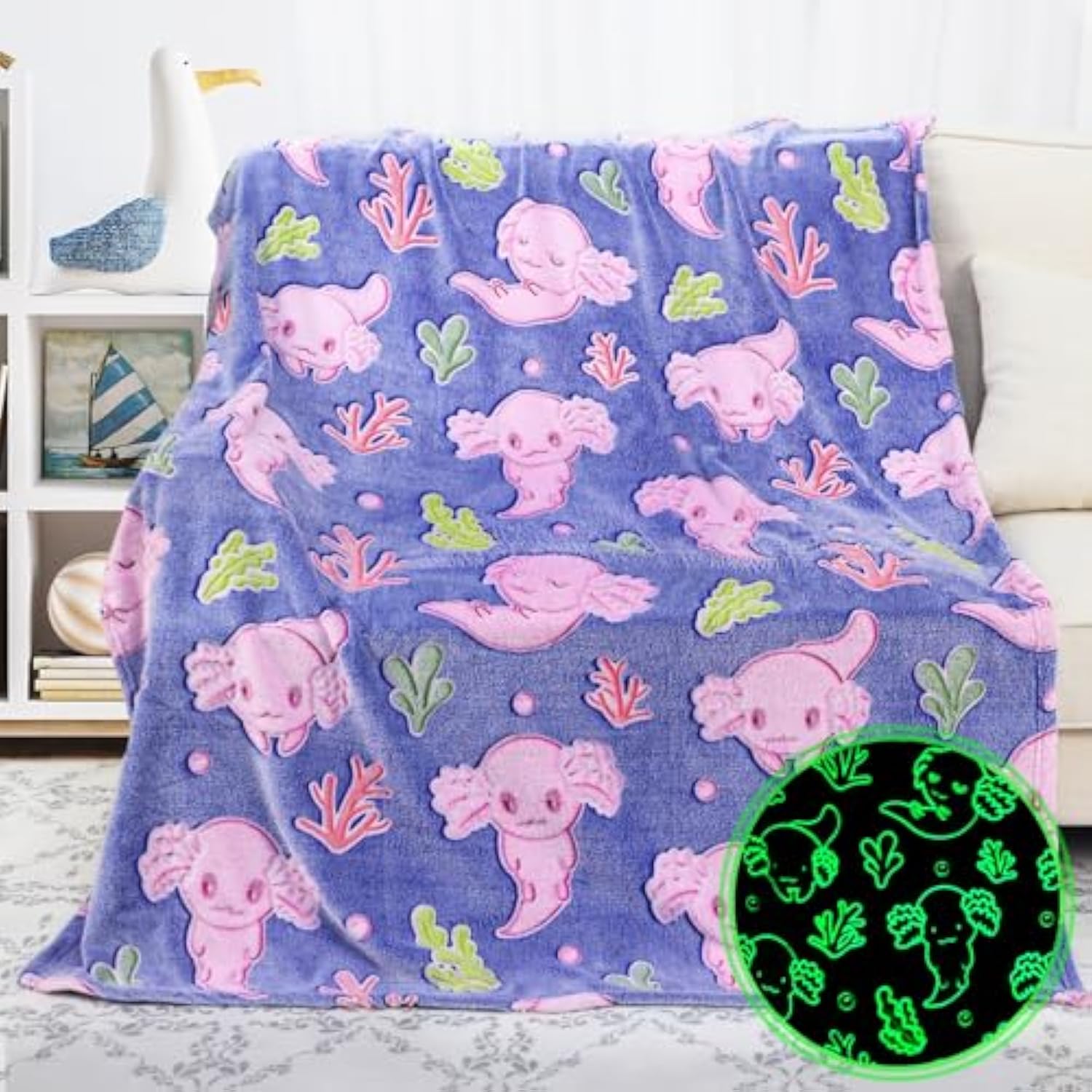 | Axolotl Blanket: Skin-Friendly Fine Fiber Plush Flannel Cozy Axolotl Blanket Provides Extra Softness And Comfort For All Girls, Boys, Teenage Kids And Adults.Lightweight And Warm. Axolotl Blankets And Throws Is Also A Lap Blanket And Bedroom Nap Blankets, Suitable For Using On Sofas, Couches, Beds, Car Journeys, Outdoor Travel Camping Or Home Decorations | | Axolotl Gifts: As A Surprise Gifts For Girls Kids, The Cute Stuff Axolotl Stuff Gifts For Teen Girls Kids, Whether It'S Birthday Or Any Other Memorial Day. This Soft Glow In The Dark Axolotl Throw Blanket Will Be Sure To Create That Funny Surprise Moment For Any Axolotl Lover. It'S Also Axolotl Toys For Girls. And Provides You With Comfort And Softness In All Seasons | | Glow Blanket: The Fun Design Of The Cool Axolotl Blankets For Girls Is That It Can Glow In The Dark, Mysterious And Interesting. Simply Expose The Axolotl Blankets To Bright Light Or Sunlight For 15-30 Minutes And See The Magic In The Dark. The Soft Light At Night Will Make The Child Feel Safe And Fun, And The Gentle Light Will Not Affect Their Sleep | | Axolotl Stuff: Axolotls Blanket With Pink Axolotls Pattern Is Undoubtedly The Cool Things For Camping, Gathering, And Picnics.Soft Volume Make It A Girls Axolotl Toys, And Can Be Used In All Seasons, Making It The Good Addition Cute Things To Axolotl Decor For Girls Bedroom. Baby Girl Blanket Can Be Used For Bedroom Nap Blankets, Sofa Leisure Blankets, Reading Books, Outdoor Use, Etc | | Easy Care: Fun Glow Speciality Makes It A Girl Boy Fun Axolotl Toys. The Axolotl Glow In The Dark Blanket Can Be Machine Washed In Cold Water And Dried At Low Temperature, And Without Compromising Luminous Performance, And Will Not Lose The Luxurious Soft Comfort Of The Kids Blanket Even After Months Of Use | |