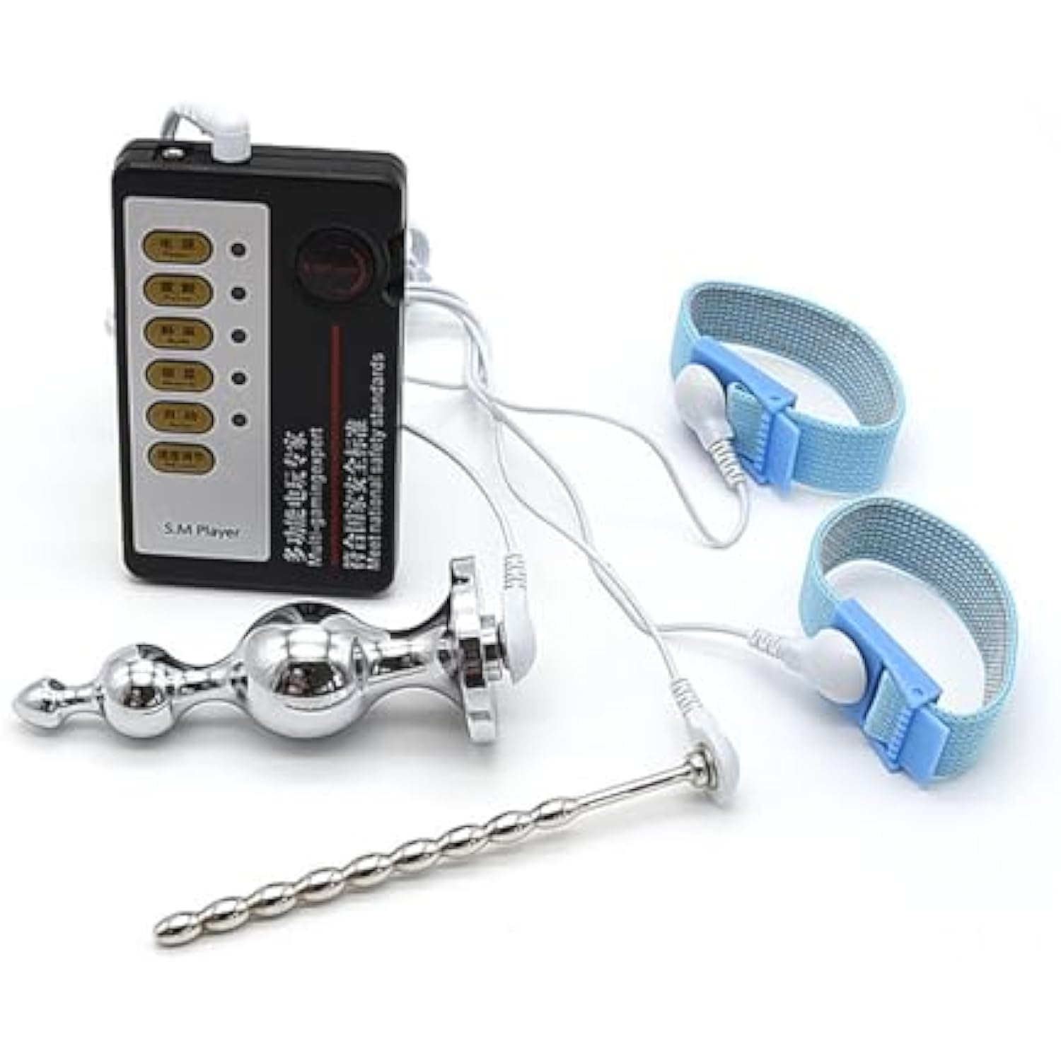 Gourd-Shaped Metal Electric Shock Anal Plug, Male Bead Urethral Penis Plug, 2 Elastic Restraint Cock Ring Electric Shock Set