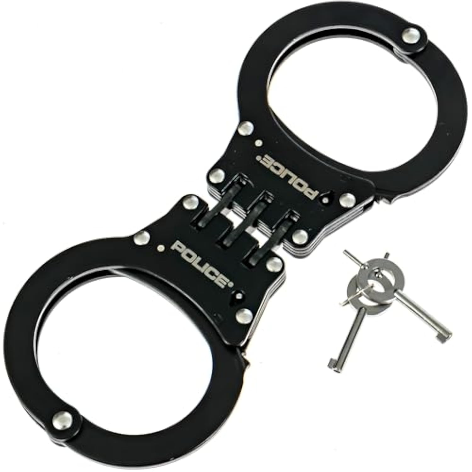 | Triple-Hinged Design for Superior Control – Limits wrist and arm movement more than chain-style cuffs, offering increased restraint and officer safety. | | Heavy-Duty Carbon Steel Construction – Built tough to withstand rigorous use in law enforcement and security environments. | | Tactical Black Oxide Finish – Non-reflective matte black coating resists rust and wear while maintaining a professional appearance. | | Double Locking Mechanism – Prevents over-tightening and ensures secure restraint during transport or physical engagement. | | Compact Field-Ready – Ideal for duty belts, gear bags, and rapid deployment in high-stress scenarios. | | Two Universal Keys Belt Holster Case Included – Comes with a pair of standard handcuff keys compatible with most law enforcement-grade cuffs and a belt holster case. | |