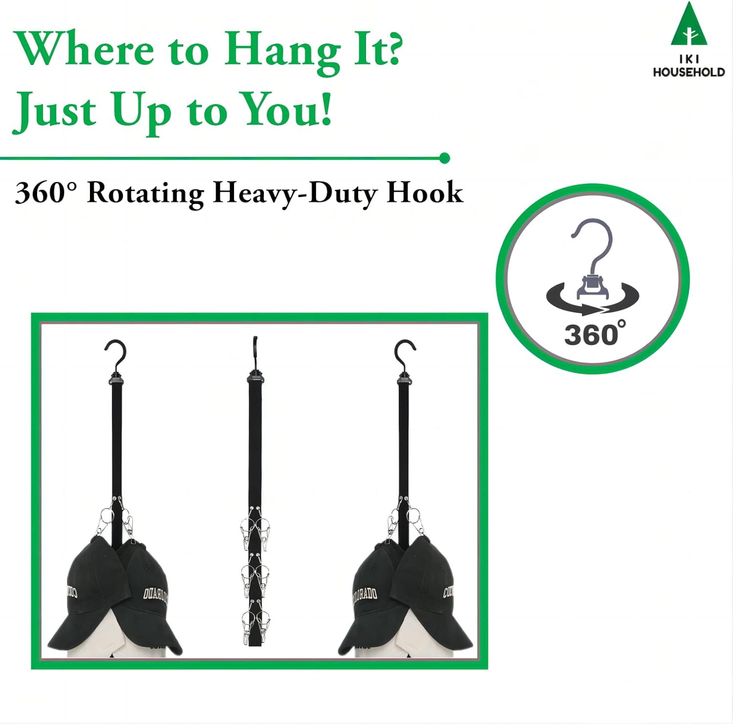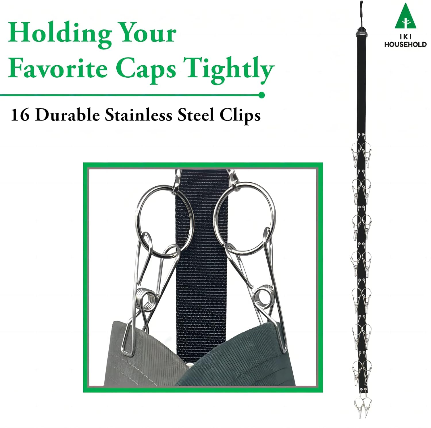 - 🏆🧢【Premium Material & Craftsmanship】- IKI hat hangers for closet is made of durable nylon belt and 16 large firm stainless steel clips, the hat rack will safety for your baseball hat storage.