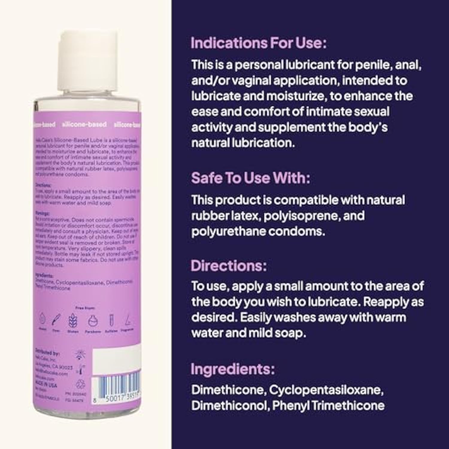 | Long-Lasting And Ultra Slippery: This Super-Glide Silicone-Based Personal Lubricant Is Formulated To Last As Long As You Do. Stop Interrupting The Fun To Re-Apply. Slide In And Enjoy. | | No Messy Cleanup: Leave The Sticky Lube In The Past! Our Lube For Women, Men, And Couples Gives You All Of The Moisture, Enjoy The Smooth Texture With None Of The Ick. Cleanup Is A Breeze, Just Use Soap And Water To Clean Up Any Spills. | | Made Of High Quality Silicone: ’S Silicone Lube Is Made Of Premium High-Quality Silicone And Is Free From Dyes, Glycerin-Free, Paraben-Free, Sulfate-Free, Alcohol-Free, And Gluten-Free. | | Condom-Friendly: This Personal Lubricant Is Versatile And Safe To Use Both In The Body Naturally And With Natural Rubber Latex, Polyisoprene, And Polyurethane Condoms. | | Made In Usa: 'S Silicone Lube Is Proudly Made In The Usa And Manufactured Under Strict Fda Guidelines. | |