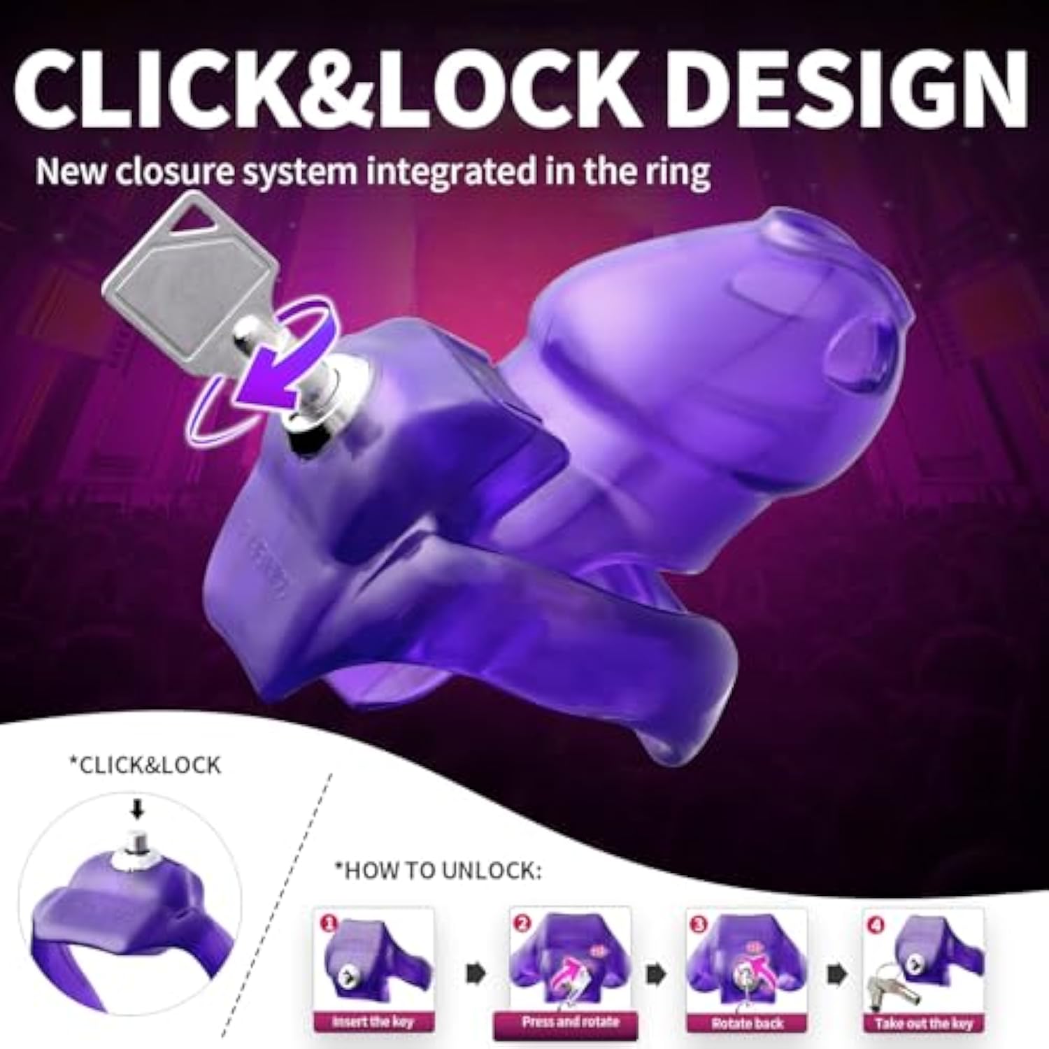 Ht-V5 Male Chastity Cage - Lightweight Resin Male Chastity Cage With Click&Lock Key | Ergonomic Design| Bondage Gear &Adult Sex Toy For Men – Includes 5 Ring Sizes (Purple, Nub)