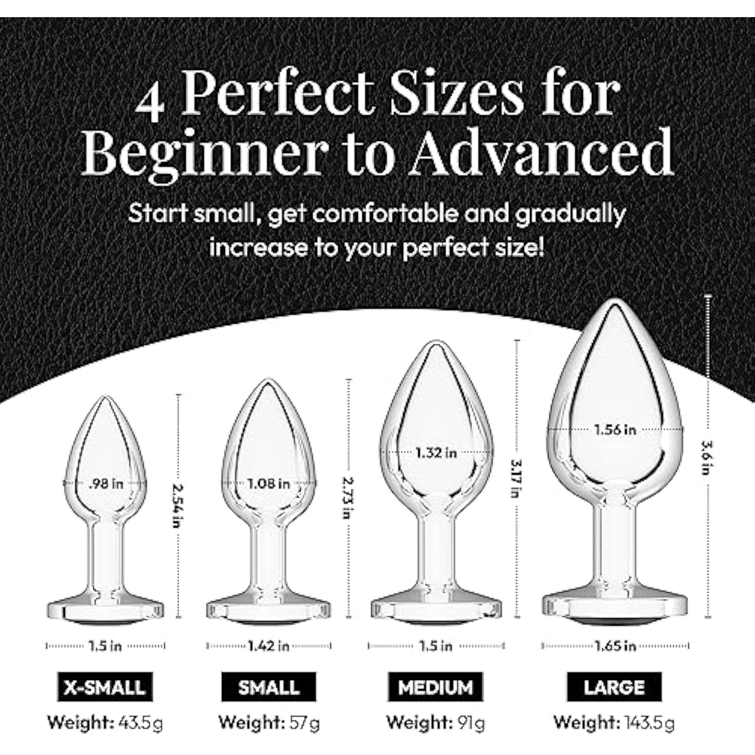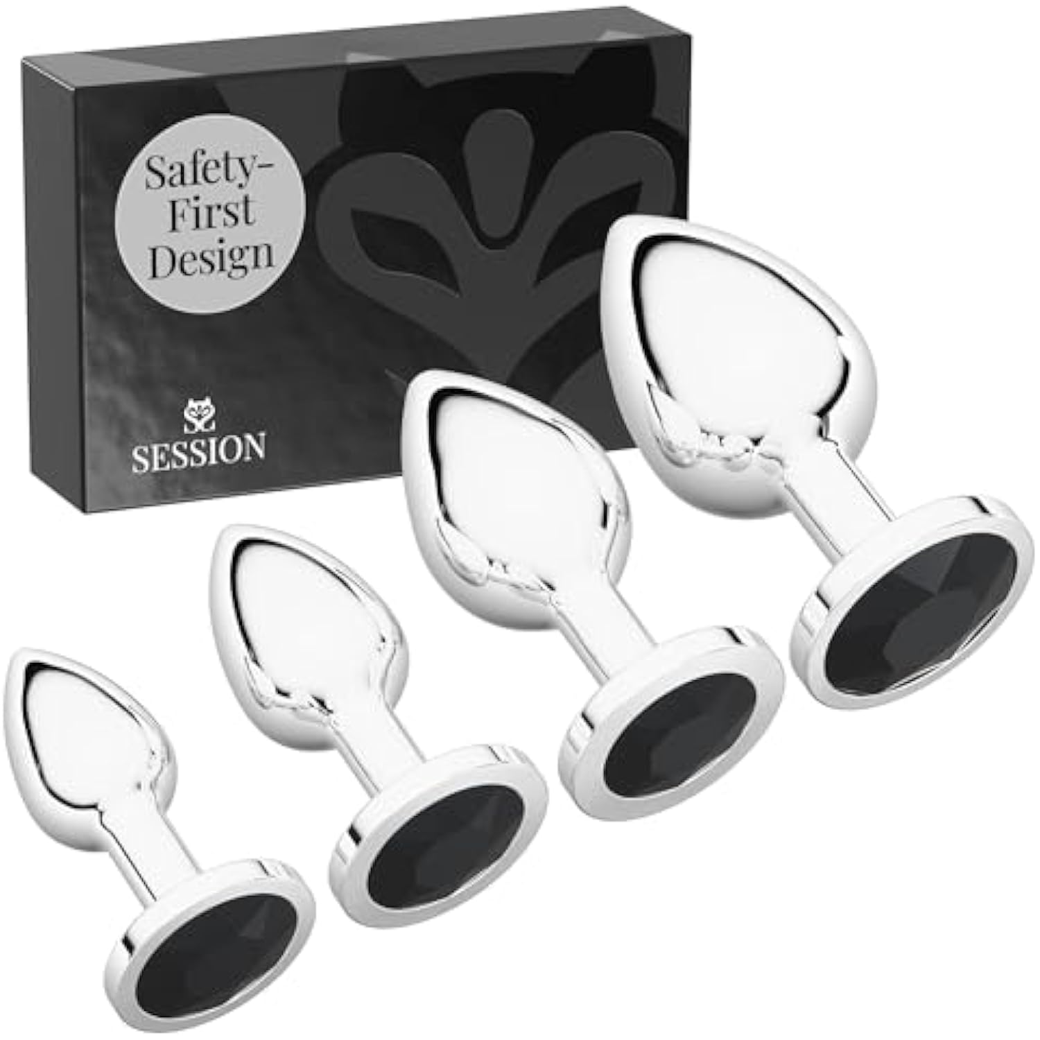 Jewel Butt Plug Beginner 4 Piece Set - Extra Small, Small, Medium, Large - Wide Base Prevents Slippage - Metal Anal Sex Adult Toy For Men & Women - Silver & Black - Circle Shaped Charm