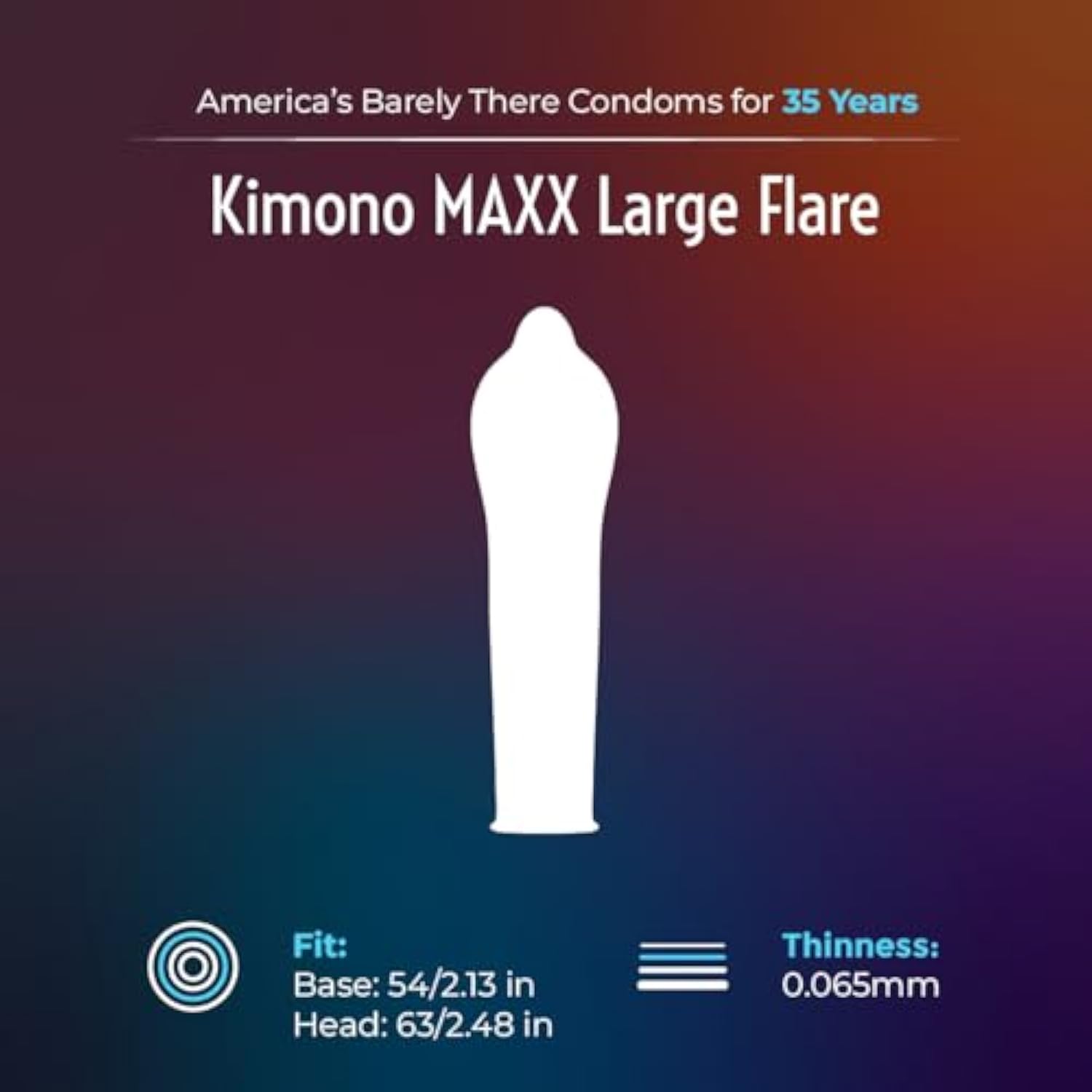 | Maximized Comfort Design: Experience unparalleled comfort, ultra thin and intensified sensations with the Kimono Maxx Large Flare condoms, featuring a unique flared shape for maximum enjoyment and a wider base for an improved, secure fit. | | Maximum Sensation: Our condoms are crafted from premium, thin vegan latex. Utilizing advanced Japanese manufacturing technology, it ensures safety and comfort without compromising sensation. | | Japanese-engineered: Kimono ultra-thin sensational condoms offer unmatched strength and reliability. With science and engineering at its core, they're tested 5X for durability, surpassing US standards, ensuring peace of mind with every use. | | Premium Vegan Material: Crafted from premium latex. Free from parabens, glycerin, spermicide, and nitrosamines. Certified to MDSAP and ISO International Quality Standards and FDA and Health Canada Requirements. | | Kimono By Mayer Labs: With over 35 years of expert research, premium ingredients, and a focus on enhancing every intimate moment with science-backed innovations. | |