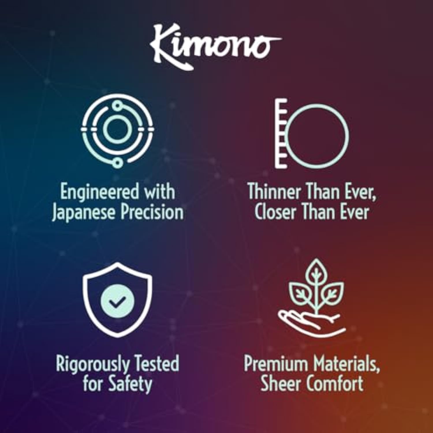 | Enhanced Sensitivity: Experience unparalleled intimacy with Kimono MicroThin condoms, boasting an exceptional thinness of 0.44mm. Feel every sensation while staying protected, ensuring a natural and close connection with your partner. Made in Japan. | | Comfort and Thinness: Our Barely There Condoms are designed for superior fit and enhanced comfort. Featuring a unique convex shape, they offer extra headroom and length for a more satisfying experience. Only Kimono has earned the name MicroThin. | | Japanese-engineered: Kimono ultra-thin sensational condoms offer unmatched strength and reliability. With science and engineering at its core, they're tested 5X for durability, surpassing US standards, ensuring peace of mind with every use. | | Premium Vegan Material: Crafted from premium latex without the unpleasant latex odor. Free from parabens, glycerin, spermicide, and nitrosamines. Certified to MDSAP and ISO International Quality Standards and FDA and Health Canada Requirements. | | Kimono By Mayer Labs: With over 35 years of expert research, premium ingredients, and a focus on mind-blowing pleasure, we enhance every intimate moment with science-backed, pleasure-focused innovations. Because science is sexy! | |