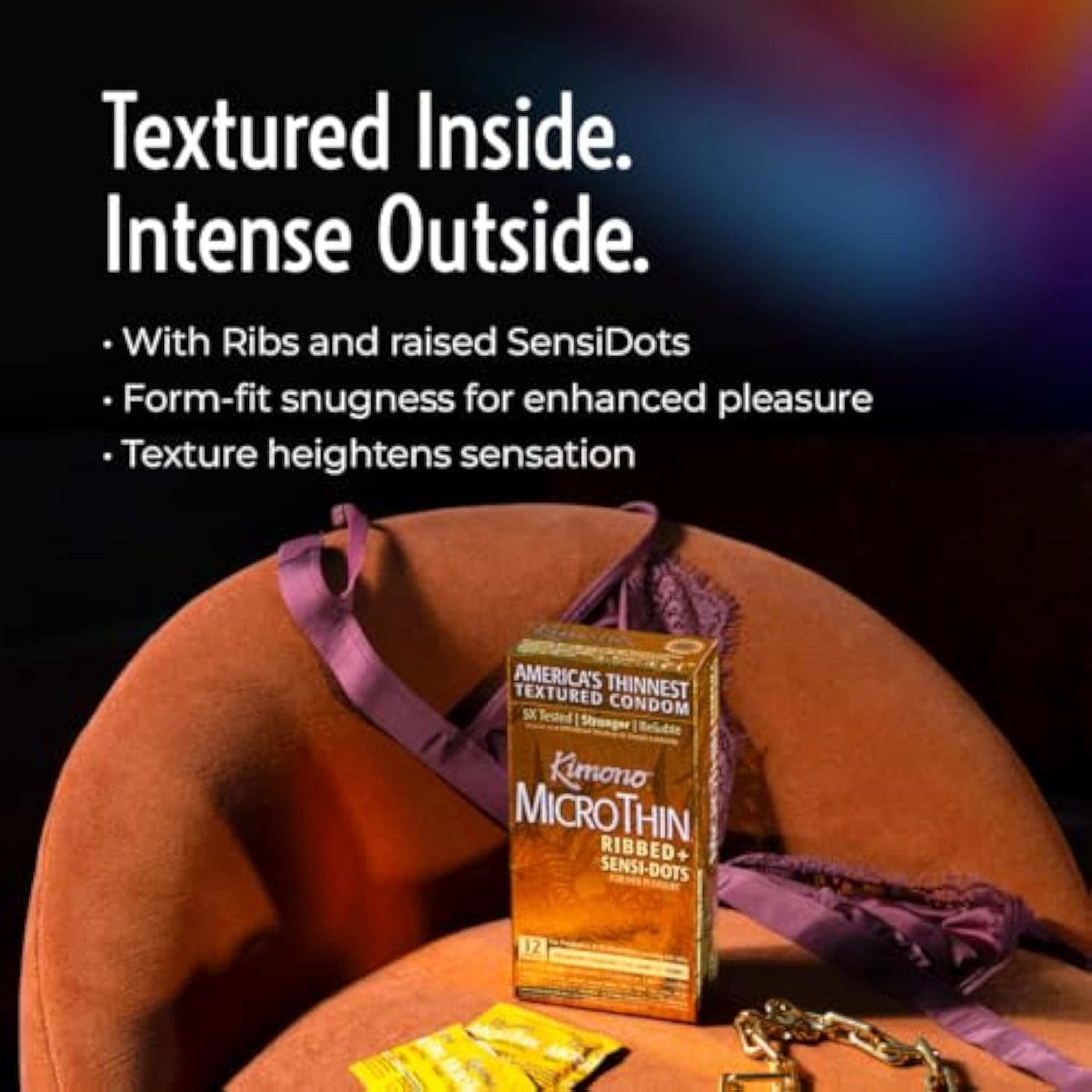 Kimono MicroThin Ribbed with Sensi-Dots Pack of 12 - Textured Lubricated Condoms, Snug Form-Fit, Natural Latex, Vegan-Friendly, No Latex Odor - Enhanced Sensitivity