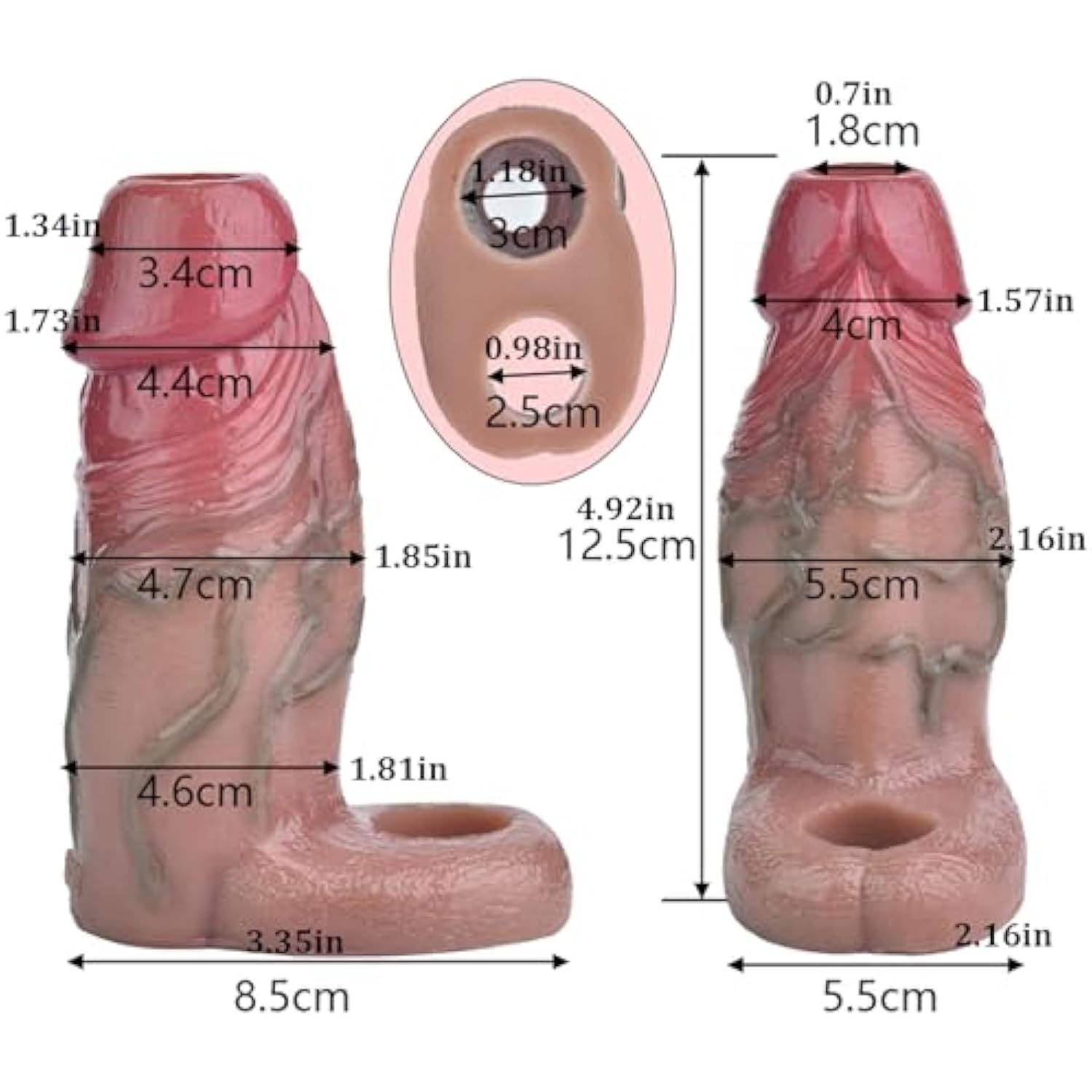 - Penis Sleeve Extender Full Length 12.5Cm(4.92In), Width 3.4-5.5Cm(1.34-2.16In), Penis Ring Inner Diameter 3Cm(1.18In), Cock Sleeve Inner Diameter 2.5Cm(0.98In).
