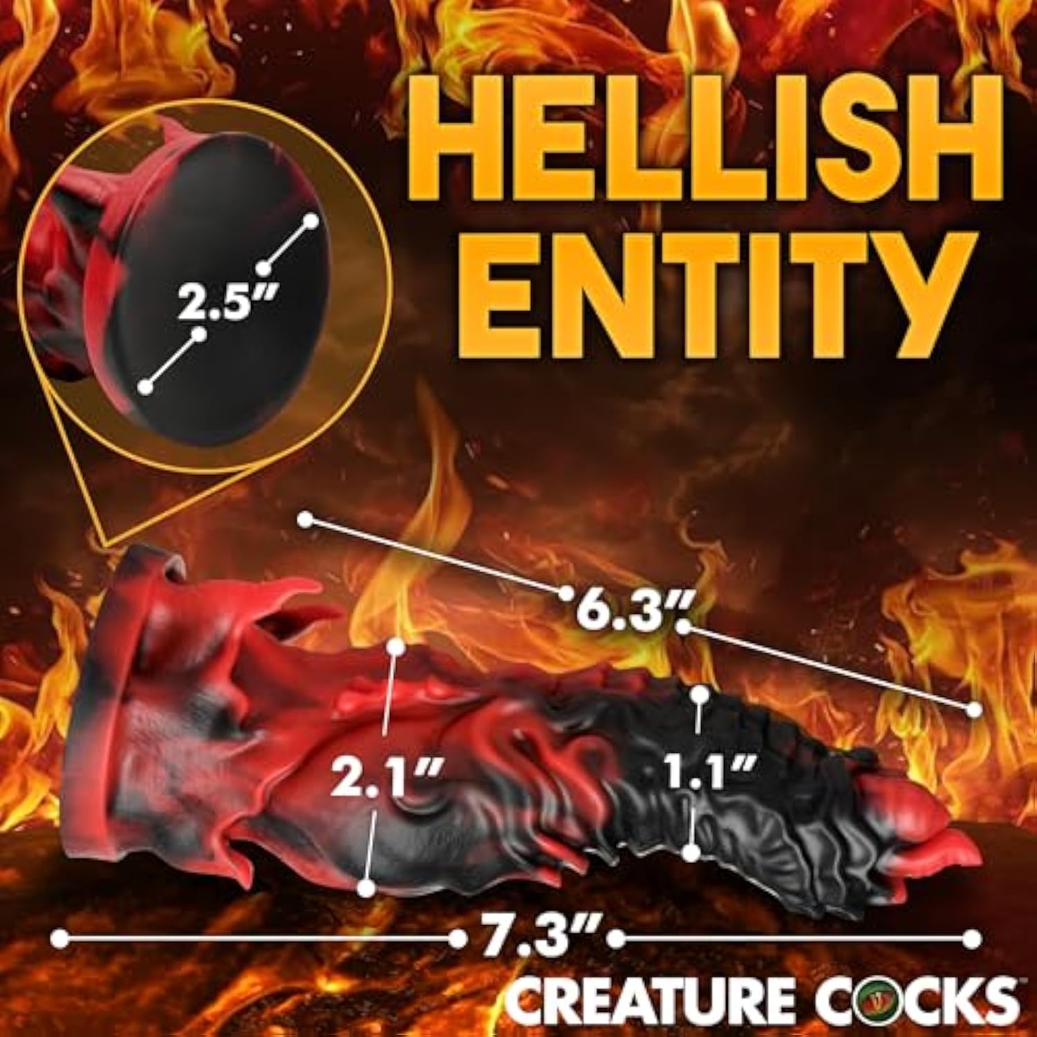 | Fantasy Dildo: This Curved, Black And Red Mephisto Dildo Has A Spine Of Ridges, Grooves, Bumps, And A Swollen Bulge At The Base For Ultimate Pleasure! | | Suction Cup Base: Enjoy The Wide, Suction Cup Base Of This Dildo. Simply Press Firmly On Any Flat Surface And Enjoy Riding It Hands-Free! | | Harness Compatible: The Wide, Flanged Base Is Compatible With Most Strap-On Harnesses So You Can Wear It And Play The Fantasy Roleplay Character You Come Up With! | | Premium Silicone: Made Of Body-Safe, Phthalate-Free, Premium Silicone, It Is Best Used With Water-Based Lubricants Only. | | Measurements: Overall Length: 7.3 Inches. Insertable Length: 6.3 Inches. Narrowest Insertable Diameter: 1.1 Inches. Widest Insertable Diameter: 2.1 Inches. | |