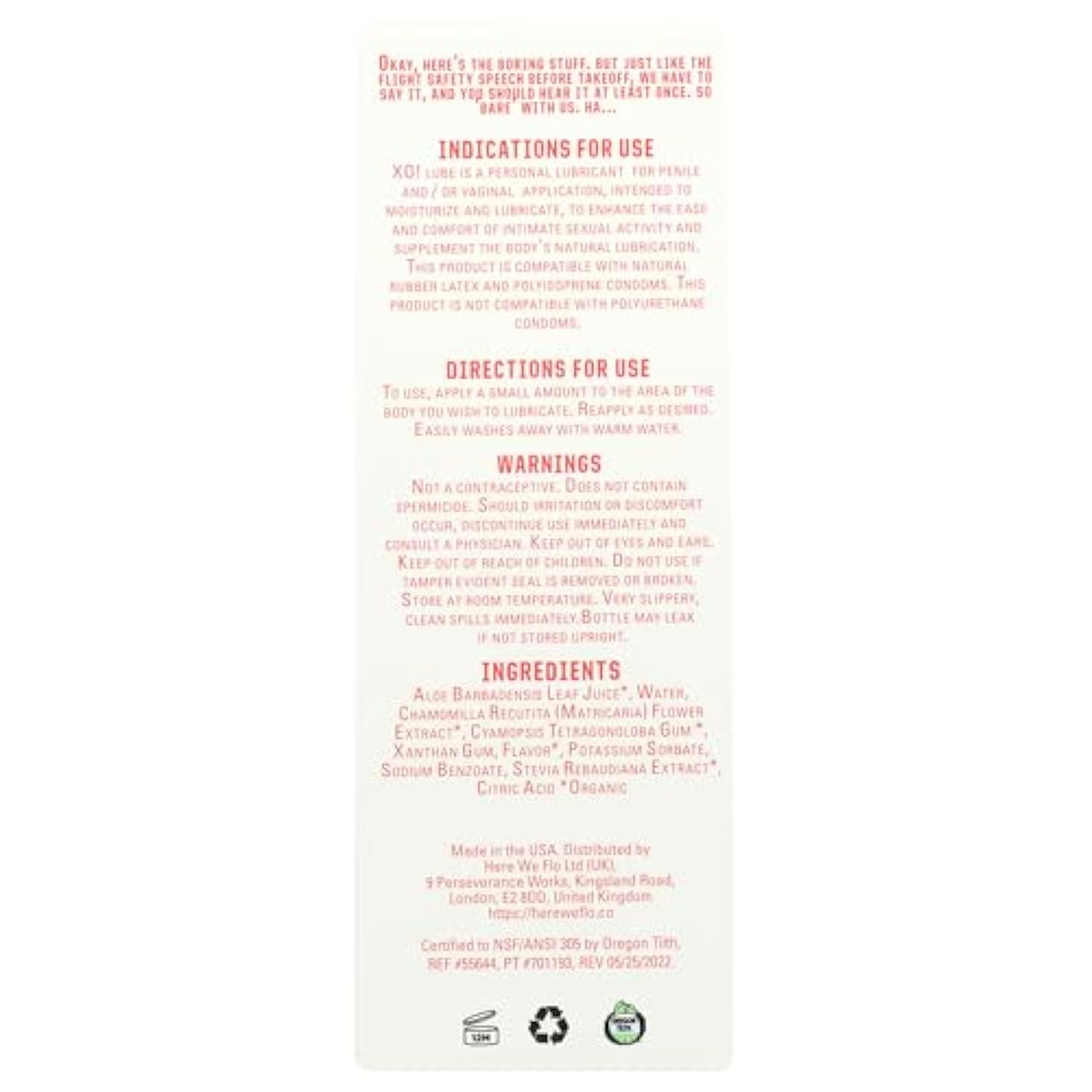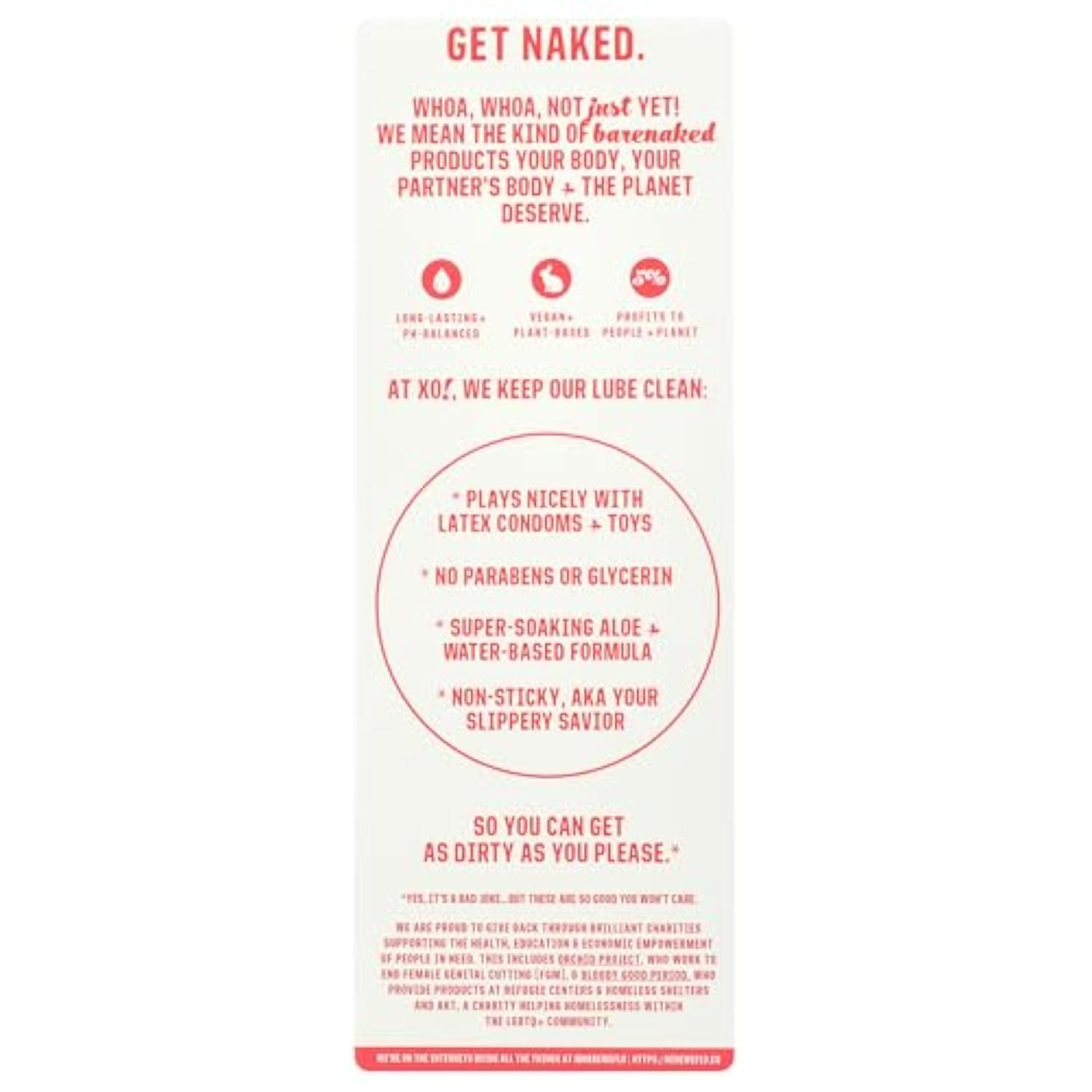 Vegan Cruelty Free - Our Water Based Lube Is Vegan And Cruelty Free | | No Parabens Or Glycerin - Our Lube Includes: Aloe Barbadensis Leaf Juice, Chamomilla Recuitita (Matricaria) Extract, Chamomilla Recuitita (Chamomile) Flower Extract, Cyamopsis Tetragonoloba Gum, Xanthan Gum, Flavor, Potassium Sorbate,Sodium Benzoate, Stevia Rebaudiana Extract,Citric Acid Organic | | Water Based Lubricant - This Lubricant Is Compatible With Natural Rubber Latex And Polyisoprene Condoms. This Product Is Not Compatible With Polyurethane Condoms (A Type Of Latex-Free Condom) | | Non-Sticky - To Use, Apply A Small Amount To The Area Of The Body You Wish To Lubricate. Reapply As Desired. Easily Washes Away With Warm Wate | | Our Story: Cheeky + Conscious - On A Mission To Create Healthier, Eco-Friendlier Products That Are Affordable, Accessible And Adorable. Founded By Women For People Who Menstruate. 5% Of Profits Go To Those In Need | |