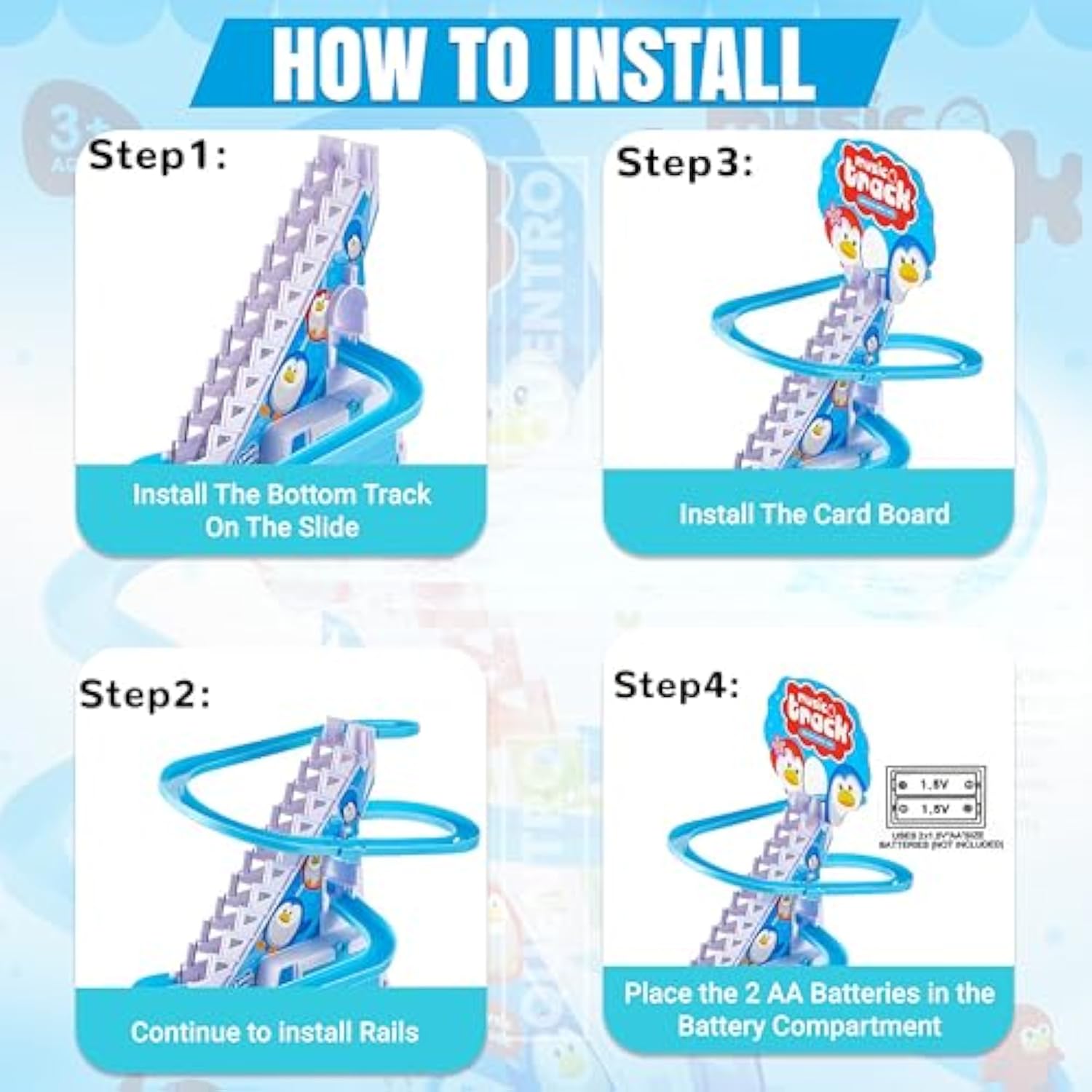 | 9-Penguin Racing Fun – Penguins Climb Stairs And Slide Down For Nonstop Excitement | | 3-Speed Switch Control – Choose Music Lights, Music-Only, Or Silent Mode | | Stem Learning Benefits – Enhances Motor Skills, Hand-Eye Coordination, And Color Recognition | | Quiet Mode For Parent-Friendly Play – Enjoy Peaceful Play Without Loud Sounds | | Durable Safe Abs Plastic – Non-Toxic, Eco-Friendly Material For Worry-Free Play | | Battery-Powered Easy Setup – Requires 2 Aa Batteries (Not Included), Quick Assembly | | Gift-Ready Packaging – Colorful Box, Perfect For Birthdays And Holidays | |