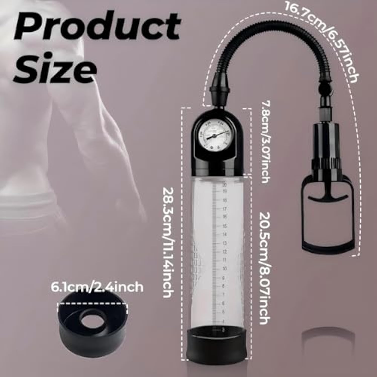 | Instant Size Enhancement Penis Enricher: Penis Pump Creates A Vacuum Suction To Increase The Length And Girth Of Your Penis To Achieve An Erection And Prolong The Duration Of Your Erection. This Helps To Improve Your Penile Erection And Boosts Male Self-Confidence. | | Penis Pump With Dial And Pressure Gauge: This Penis Pump Has A Transparent Pump Tube With A Precise Scale On The Surface, So You Can Clearly See The Effect And Changes Of Your Workout. With The Pressure Gauge On Top Of The Penis Pump, You Can Clearly See The Pressure Range You Can Accept And How Your Penis Grows As The Pressure Increases. | | Quality Safe Material: Our Penis Pumps Are Made Of High Quality Material, Durable Abs Material For The Penis Enhancer Tube Body And The Barrel Is Clearly Graduated, High Quality Silicone Material For The Casing, Safe And Easy To Clean, Ensuring Your Health And Safety In Use. | | Ergonomical: The Comfortable Handle Of The Enlarged Pump Fits Your Hand Perfectly And Allows You To Adjust The Air Pressure Easily. Three Sizes Of Silicone Ring Hole Diameter: 0.55In/0.78In/0.98In (14Mm/20Mm/25Mm), The Length Of The Tube Body Is 7.87In (20Cm), Which Is In Line With Most People'S Penis Size And Experience Level. | | Confidential Packaging: All Products In Our Shop Are Packaged In Neutral Packaging, We Will Protect The Privacy Of Each