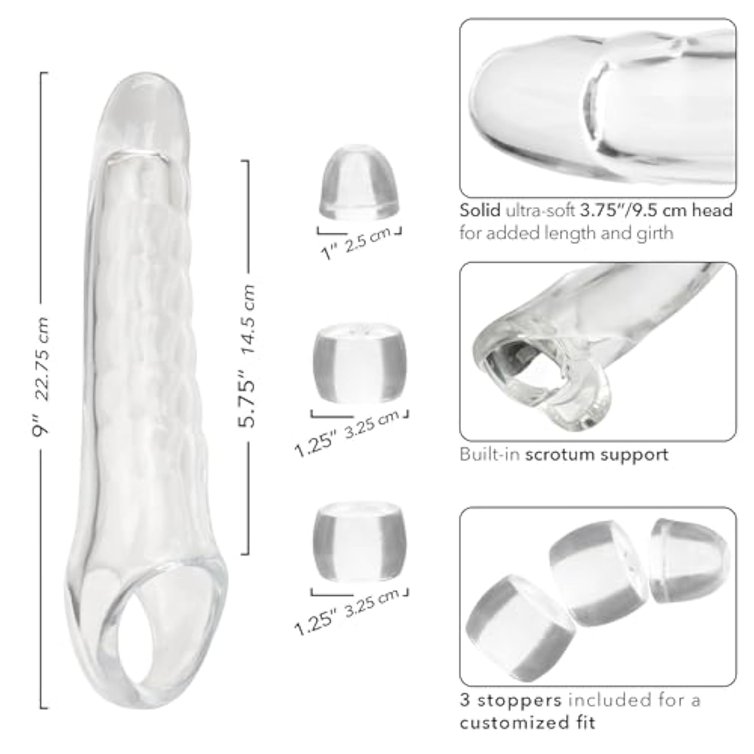 | Solid Ultra-Soft 3.75 Inch (9.5 Cm) Head For Added Length And Girth; 3 Stoppers Included For A Customized Fit | | Stretchy And Comfortable Transparent Design To Enhance Your Natural Assets | | Hollow Design With Built-In Scrotum Strap | | Body-Safe, Unscented, Phthalate Free | | 1-Year Manufacturer | |