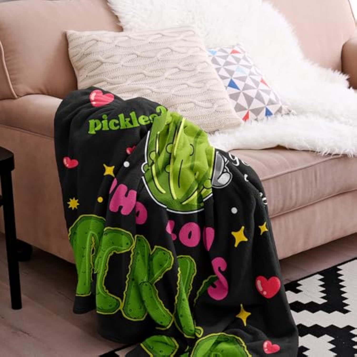 | Best Pickle Lover Gift: The Blanket Is Fashionable And Eye-Catching With Colorful Pickles, Which Is A Perfect Gift For A Girl Who Loves Pickles With The Stunning Point Of The Creative Image And Realistic Print. | | Stunning Point: Pickles World Is A Cool Dream For A Kid That Could Accompany Them Stepping Into An Adventure Path To Meet Their Childhood Wishes. | | Ultra-Soft Material: We Utilize Fine Skin-Friendly Microfiber Flannel To Give Users An Ultra-Soft Touching And Great Experience. This Kind Of Fabric'S Other Feature Is Good For Use. | | Reasonable Size And Thickness: The Blanket Is Designed To Be 40"X50" Inches So As To Fit All Ages. Besides, The Reasonable Thickness Is For All-Season Use. | | Applicable Occasions: You Can Use Cover This Blanket On The Couch Or Bed To Keep Your Warmth When You Are Beneath The Air-Conditioner In Summer Or By The Fireplace In Winter. It Is Outdoor Usable. Your Comfort Can Be Ensured By Wrapping With The Blanket Or Laying Down On It At A Party, A Beach, Or A Picnic. | |