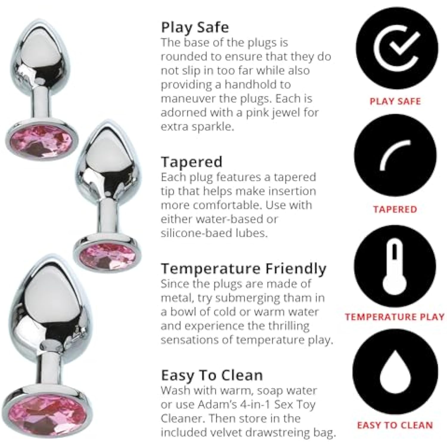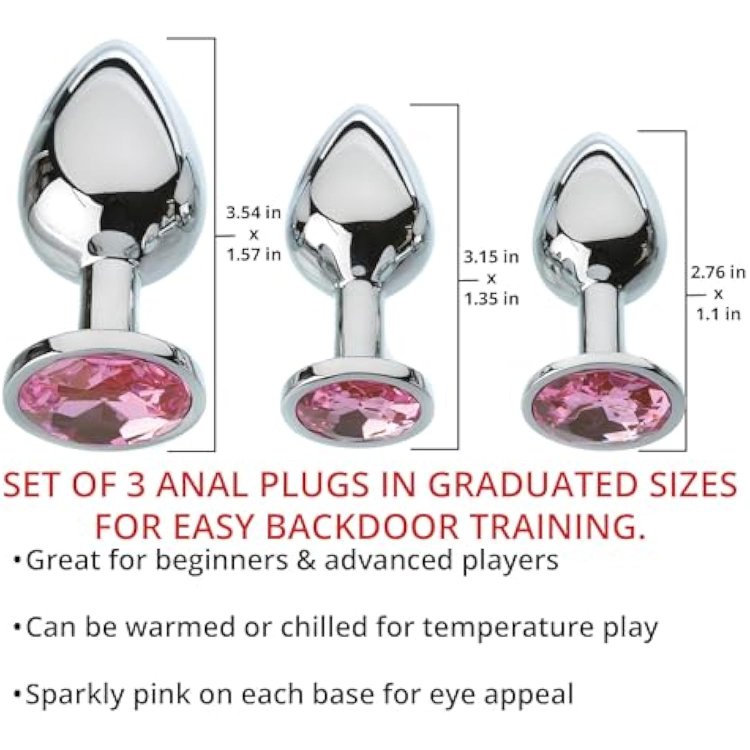 Pink Gem Anal Plug Set – 3 Butt Plug Sizes, Body-Safe Aluminum, Temperature Play, Sparkling Pink Jewel Base, Includes Velvet Storage Bag - Anal Training Kit For Backdoor Play