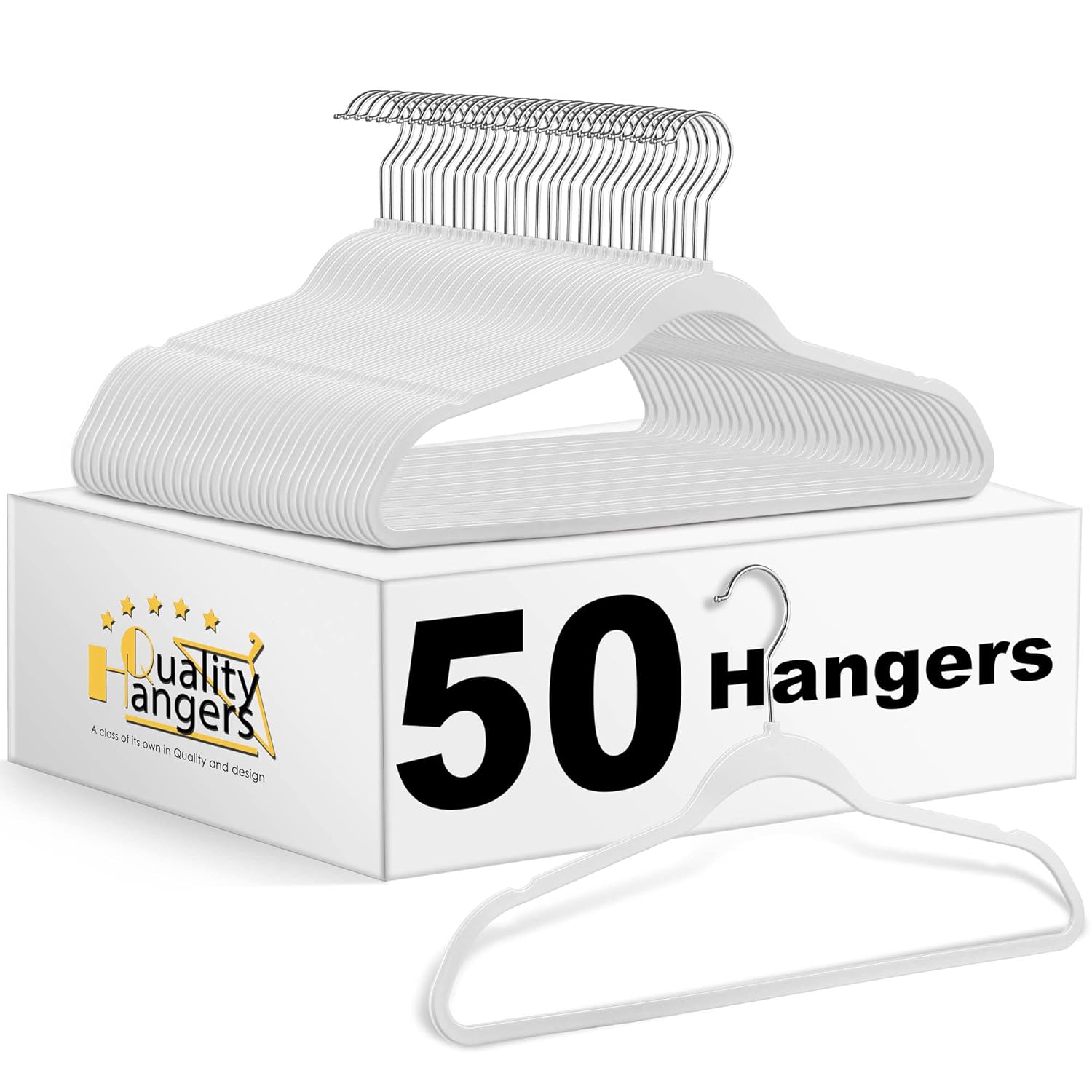 - High-Quality Material: Made from durable ABS plastic and featuring a 360° metal swivel hook, our white hangers 50 pack are built to withstand the weight of your heavy clothes. Hang winter coats or jackets, our non-flocked durable hangers won't break or bend