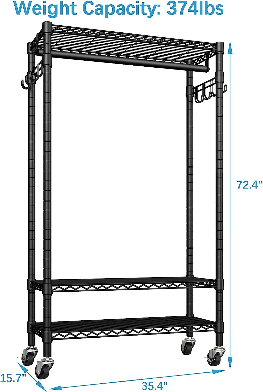 - ăWell-Organized Clothes RackăVipek garment rack is with dimension 35.4"Lx15.7"Wx72.4"H, max load 374lbs. Besides, single hanging rod hold up to 90lbs and single wire shelf 88lbs. For someone with limited storage, this helps to keep things tidy and organized.