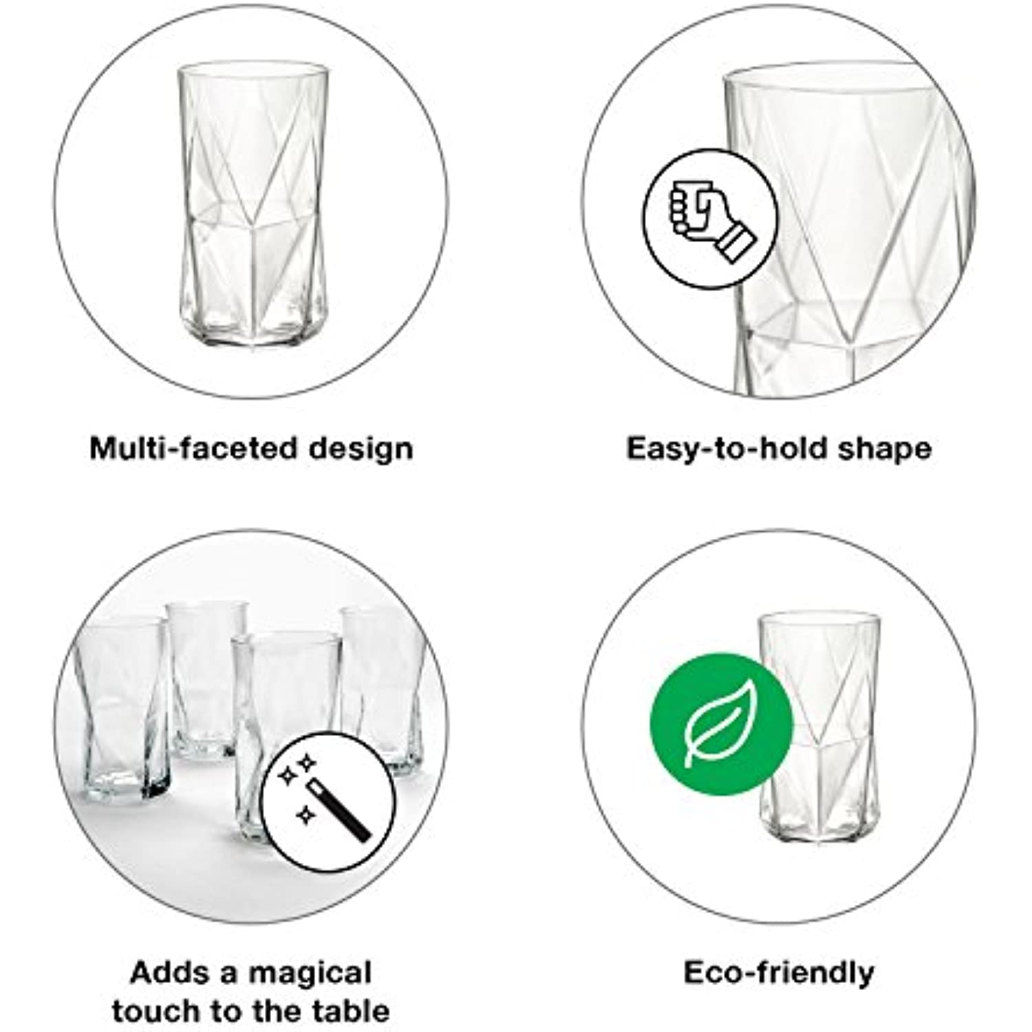 - Unique faceted design provide a comfortable grip and are perfect for spirits on the rocks, juice and more.