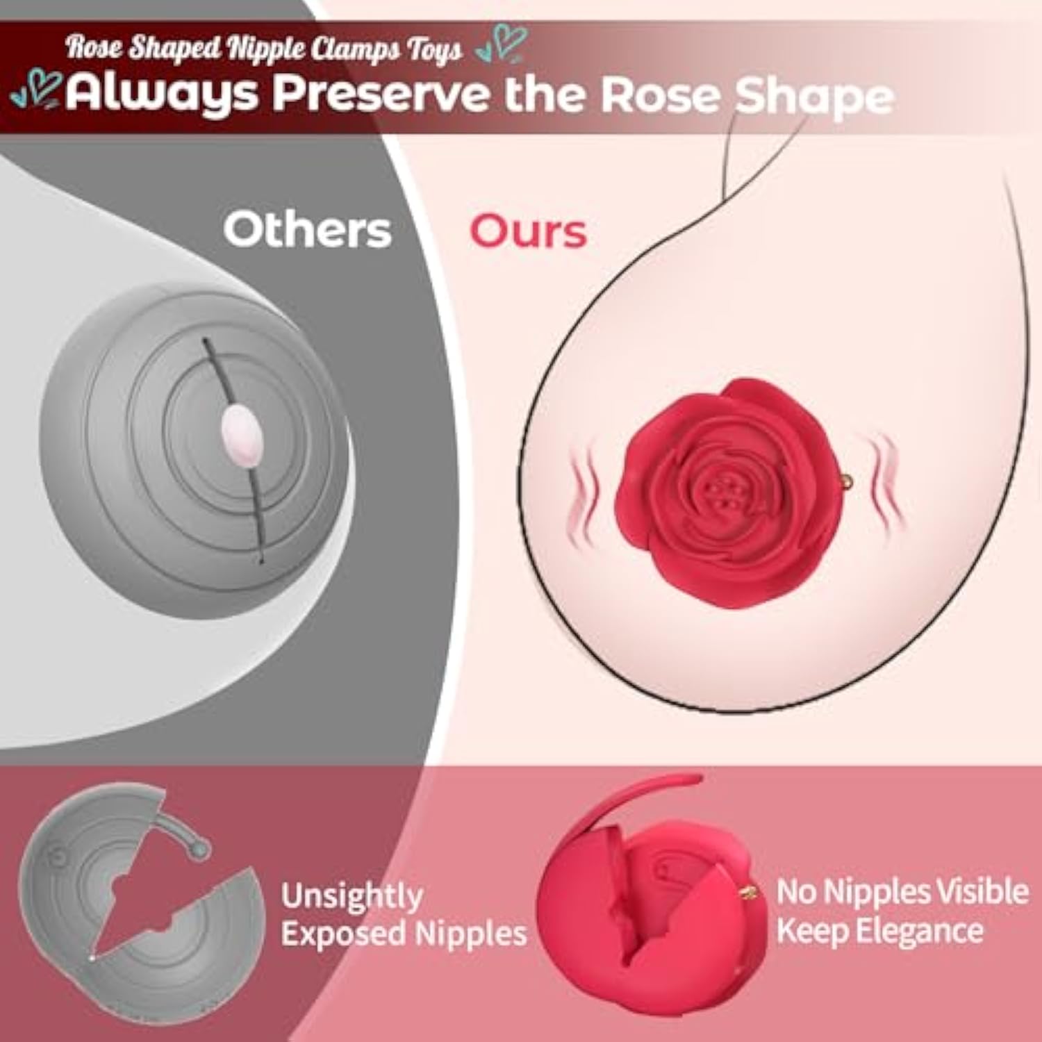 - Rose-Shaped Bdsm Vibrating Nipple Clamps- The Unique And Innovative Rose-Shaped Nipple Toys Offer A Stunning Visual Appeal While Pinching You Or Your Partner. Meanwhile, They Deliver An Exquisite Nipple Pinch And Vibration, Bringing Overriding Nipple Cl