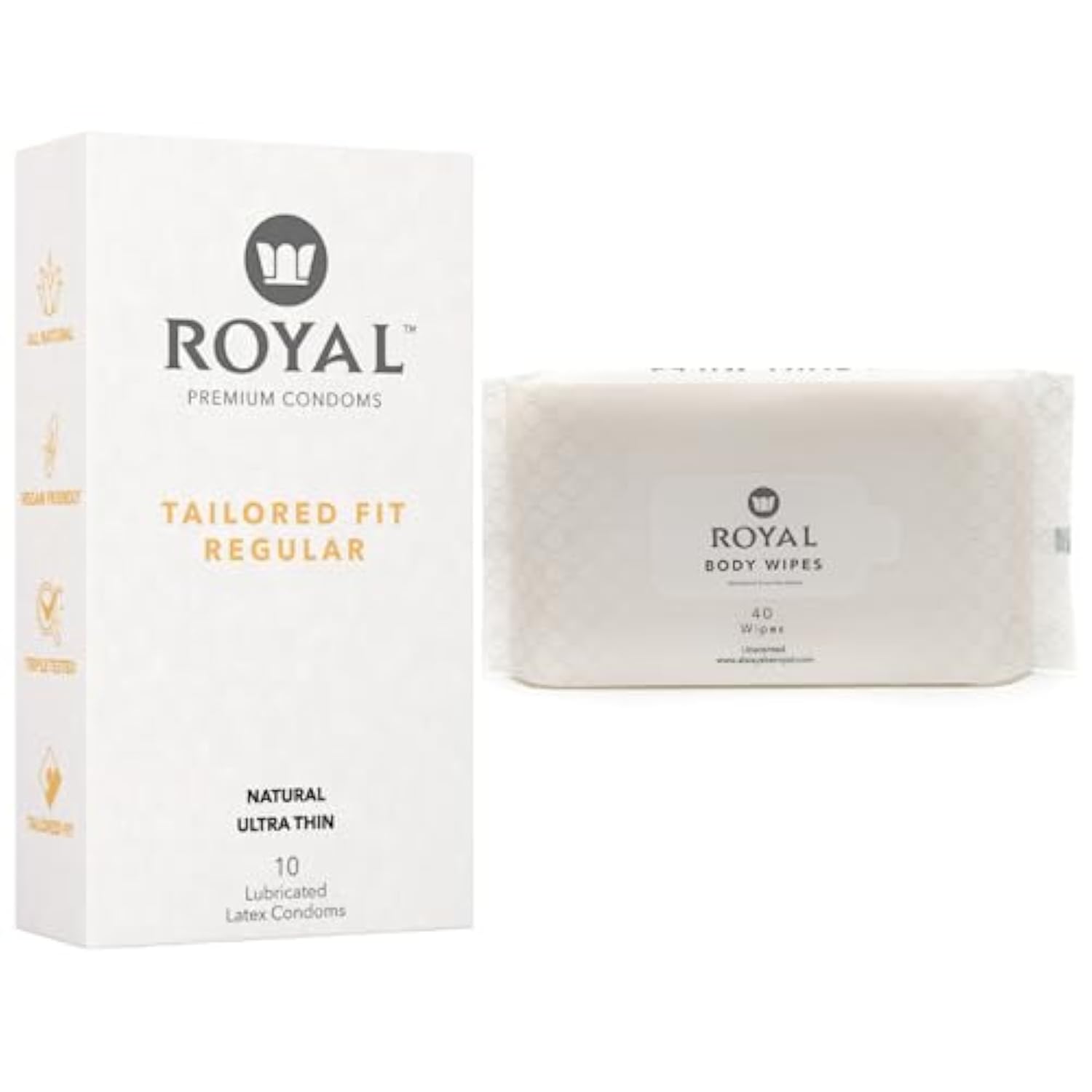 Royal Tailored Fit Ultra Thin Vegan Condoms 10 Pack & Intimate Cleansing Feminine Wipes for Personal Cleansing & Odor Removal 40 Count Bundle