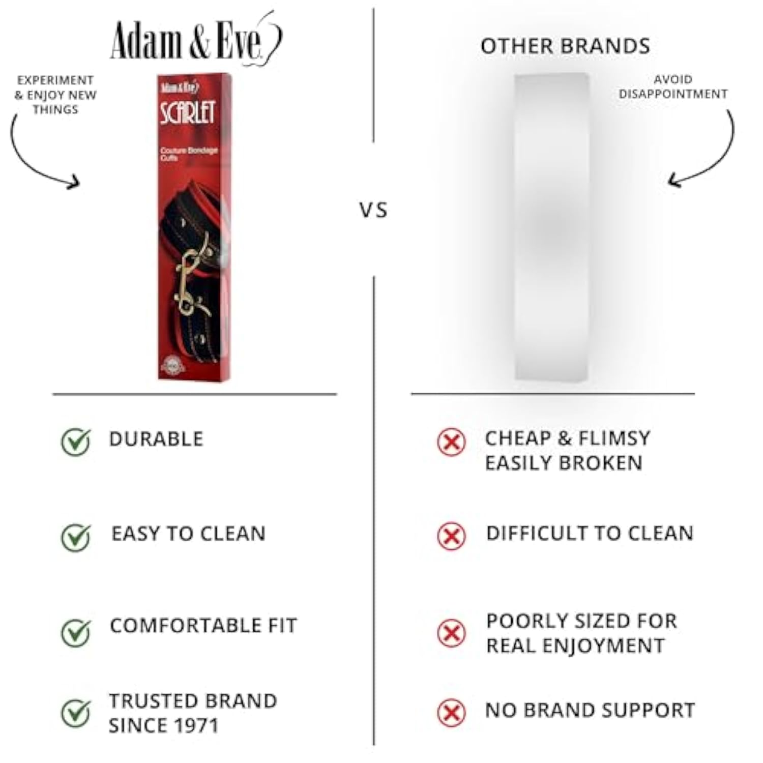 | Adjustable Bondage Cuffs For Wrists Or Ankles: Explore Thrilling Restraint Play With Adam Eve’S Scarlet Couture Bound To Surrender Cuffs. Designed For Comfort And Control, These Adjustable Cuffs Fit Wrists Or Ankles Securely, Keeping Your Partner Right Where You Want Them For Kinky Pleasure | | Padded Vegan Leather For Style And Comfort: Crafted From Soft, Durable Vegan Leather, These Padded Cuffs Provide A Comfortable Yet Firm Hold. Perfect For Beginners And Experienced Bondage Lovers, They Add A Stylish Touch To Your Bdsm Collection While Ensuring Your Playmate’S Comfort | | Easy-To-Use Velcro Straps And Metal Clip: The Secure Velcro Straps Allow For Quick Adjustments, Ensuring A Snug Yet Safe Fit. A Sturdy Metal Clip Fastens The Cuffs Together Or Attaches Them To Bondage Accessories, Bedposts, Or Shower Rods, Offering Endless Possibilities For Restraint Play | | Perfect For Bdsm, Roleplay, And Couples Play: Whether You Are Looking To Spice Up Your Romantic Evenings Or Explore New Power Dynamics, These Cuffs Are A Must-Have. Combine Them With Other Bondage Gear For An Unforgettable Experience Or Use Them Alone For Sensual Teasing And Control | | Trusted Usa Brand Since 1971, Adam Eve Is Committed To Providing High-Quality Lubricants And Superior