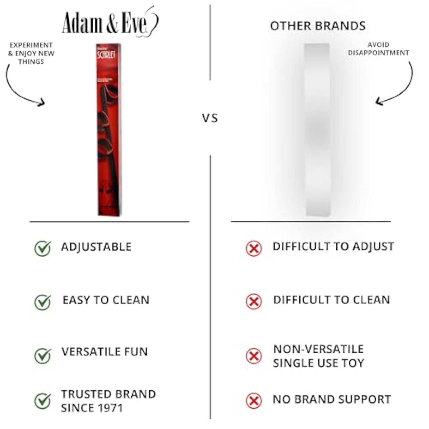 | Explore Kinky Positions With A Spreader Bar: Open Up New Possibilities In The Bedroom With Adam Eve’S Scarlet Couture Spreader Bar. Designed To Keep Legs Or Arms Restrained, This Bondage Bar Allows For Deeper Penetration, Better G-Spot Or P-Spot Access, And Thrilling Roleplay Scenarios | | Built-In Wrist And Ankle Cuffs For Bondage Play: Featuring Two Pairs Of Attached Cuffs, This Spreader Bar Offers Multiple Restraint Options For Bondage Lovers. Secure Wrists And Ankles In Different Positions For Standing Doggy, Leg-Spread Oral, Or Fully Restrained Missionary | | Soft Padded Cuffs With Secure Velcro Closure: Designed For Comfort And Ease Of Use, The Adjustable Velcro Cuffs Provide A Snug Yet Gentle Fit, Making Them Perfect For Beginners. The Soft Padding Ensures Restraint Without Discomfort, So You Can Focus On Pleasure And Control | | Durable Design With Nylon Wrapped Metal Bar: Built For Long-Lasting Play, This Spreader Bar Is Crafted From Strong Metal Wrapped In Durable Nylon For Extra Stability. The Lightweight Yet Sturdy Construction Allows For Easy Maneuvering While Keeping Your Partner Firmly In Place | | Trusted Usa Brand Since 1971, Adam Eve Is Committed To Providing High-Quality Lubricants And Superior