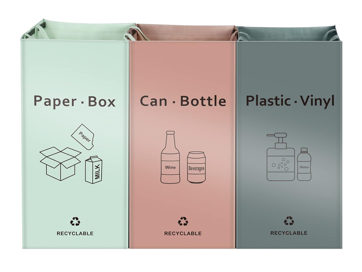 - 🌺 【MULTI-PURPOSE】- Please insert black plastic stripes under the handles. Those actually keep bags in shape and you have to insert them before use.It is not only recycle bin, but also laundry basket. The color of the indoor recycle bag is composed of pink, gray and light green. It is very natural and coordinated. Spacious 3 compartments allow you to neatly organize all recycling waste,great for kitchen, home, office, garages. Their easy care makes them a great choice for garden clean up or waste bins.