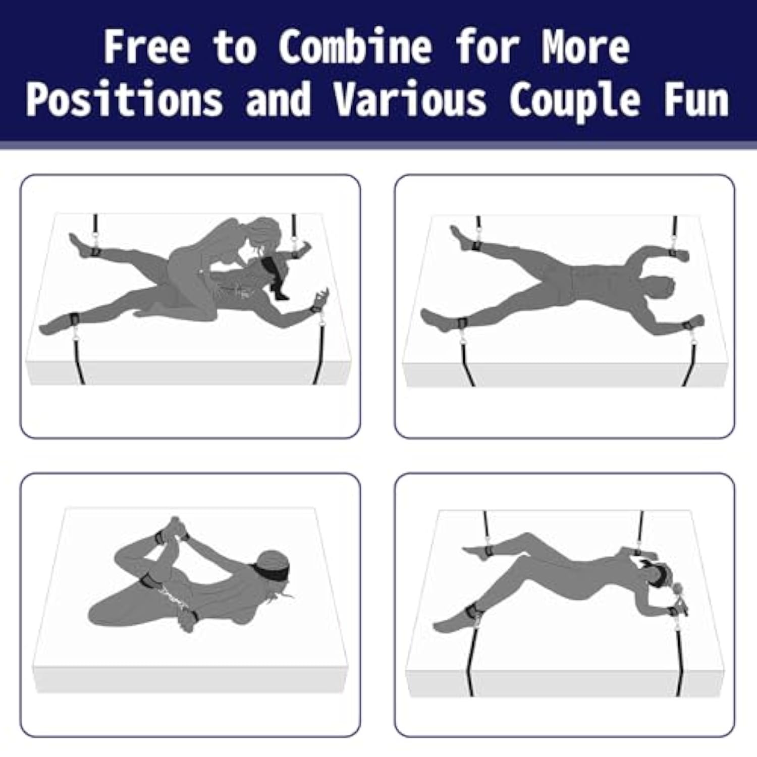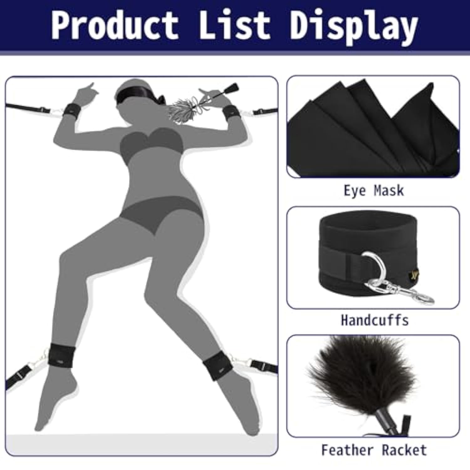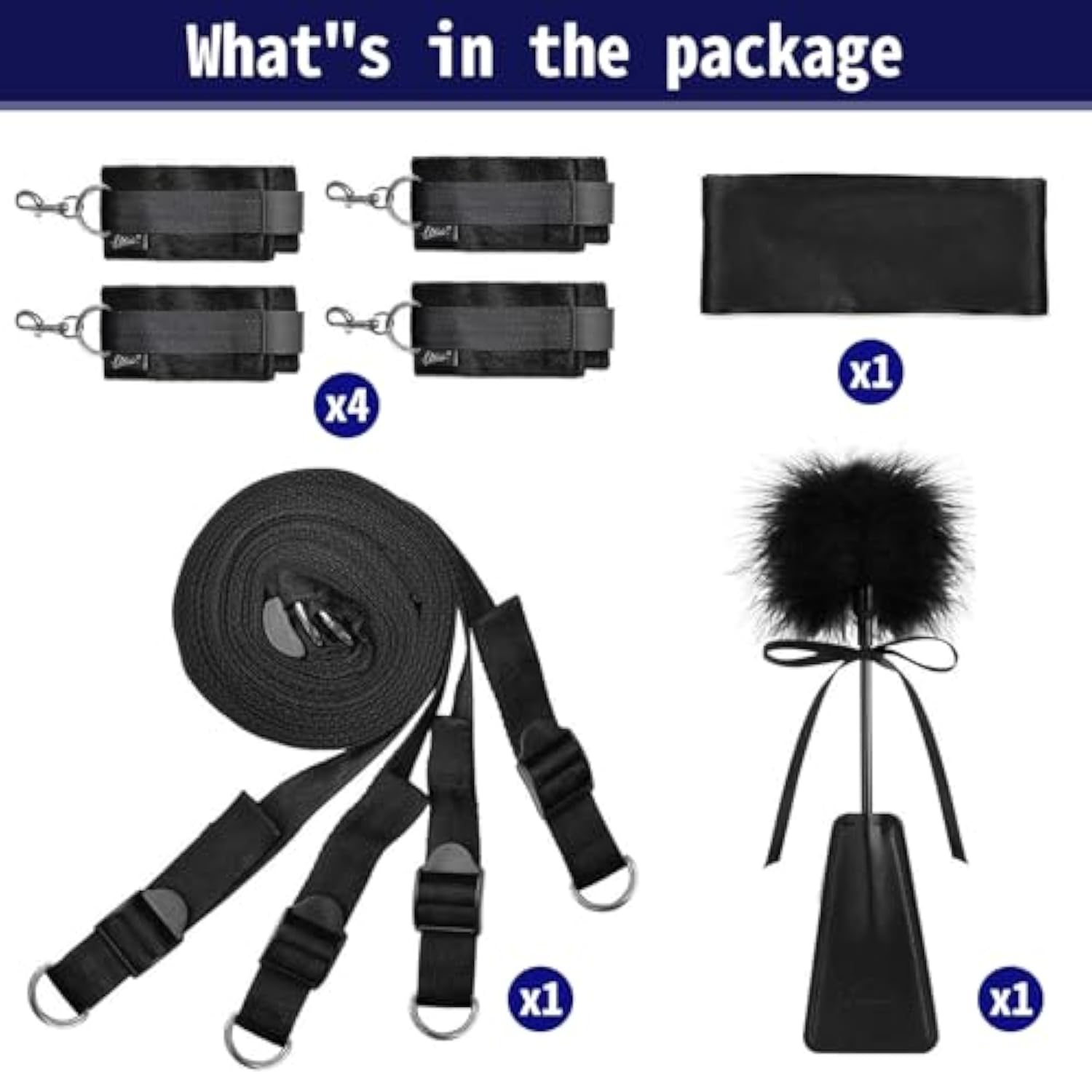 | Adjustable Sex Bondage Set For Versatile Play: This Bdsm Bed Restraints Kit Includes 4 Padded Handcuffs And Adjustable Nylon Bondage Straps, Can Fit Most Bed Sizes And Furniture In Bedroom. The Sex Straps Are Perfect For Bed, Chair, Or Table Restraint Setups To Explore Limitless Bondage Positions. | | Comfortable Padded Cuffs For Wrists Ankles: This Under The Bed Restraint Has Comes With 4 Attached Bondage Cuffs With Sweat-Resistant Material Ensure Maximum Comfort. The Bdsm Cuffs Are Fully Adjustable, So You Can Tighten Or Loosen Them As Needed. Velcro Fasteners Allow For Quick Adjustments, Whether Used As Handcuffs, Leg Shackles, Or Even Hog Ties For Adventurous Play. | | Blindfold Feather Paddle For Sensory Play: The Bdsm Kit Include A Silky Blindfold And A Feather Tickler Paddle. Use The Sexy Blindfold To Immerse Your Partner In Complete Darkness And Enhance Your Partner'S Sensations. The 2-In-1 Paddle Features A Feather Tickler For Teasing And A Smooth Surface For Gentle Spanking, Sparking Wild Fantasies. | | Easy Installation And Fit For Most Bed Size: This Couple Sex Toy Is Simple Design For Easy Installation And Adjustable Fit For All Beds, No Matter You Are King Size Or Queen Size. You Simply Slide The Straps Of The Restraint Set Under The Mattress Or Just Tie Them To Furniture In Bedroom. Once Done, Tuck The Restraint Kit Under The Bed Or Disassemble For Portable And Discreet Storage. | | Great Sex Toys For Couples Discreet Packaging: This Sex Restraint For Bedroom Is Great Bdsm Toys For Couples Exploring Adventurous Kinky Sex Games Or Want To Increase Intimacy And Pleasure To Your Relationship. Transform Your Bed Into A Devious Piece Of Bondage Furniture With The Under-The-Bed Restraint Set! And The Adult Toy Will Be Delivered In Secret Package To Protect Your Privacy. | |