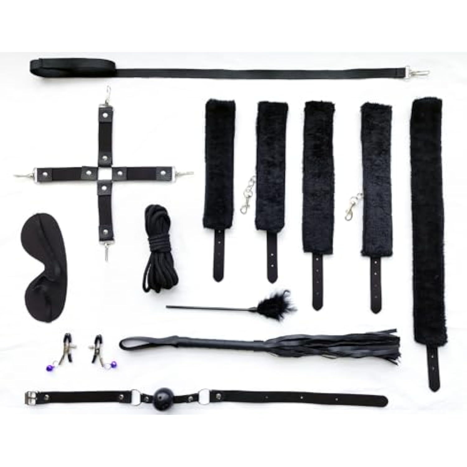 Sex Bondage Bdsm Kit Restraints,10 Piece Sets With Adjustable Handcuffs,Collar, Ankle Cuff,Blindfold,Feather Tickler, Nipple Clamps, Restraint Kits For Male And Female Couples, Adult Products,Black