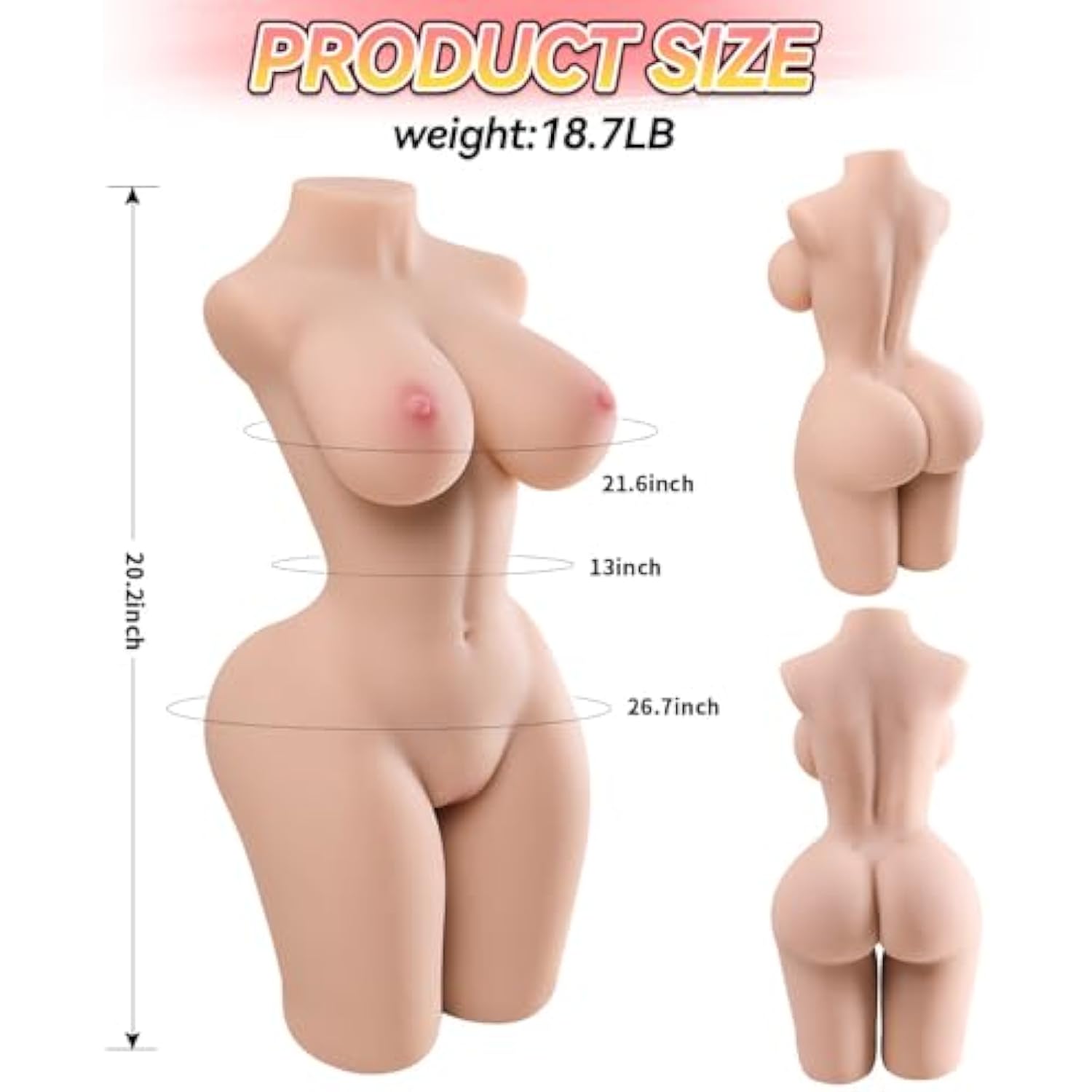 - ?? Perfect Figure Size?She Is A Sex Doll Adult Torso Sex Toy For Men, The Height Is 21 Inches,She Have A Beautiful,Pink,Soft 21.6 Inches Big Chest, And A Elastic 27 Inches Big Butt.Her Weight : 20Lb. The Male Masturbator Sex Doll Is Bigger And Has Better Experience Than Ordinary Sex Stroker,And It Is Still Easy To Clean And Storage.The Design Inspiration Comes From The Queen Of Hornets,The Whole Female Torso Full Of Feminine Beauty.