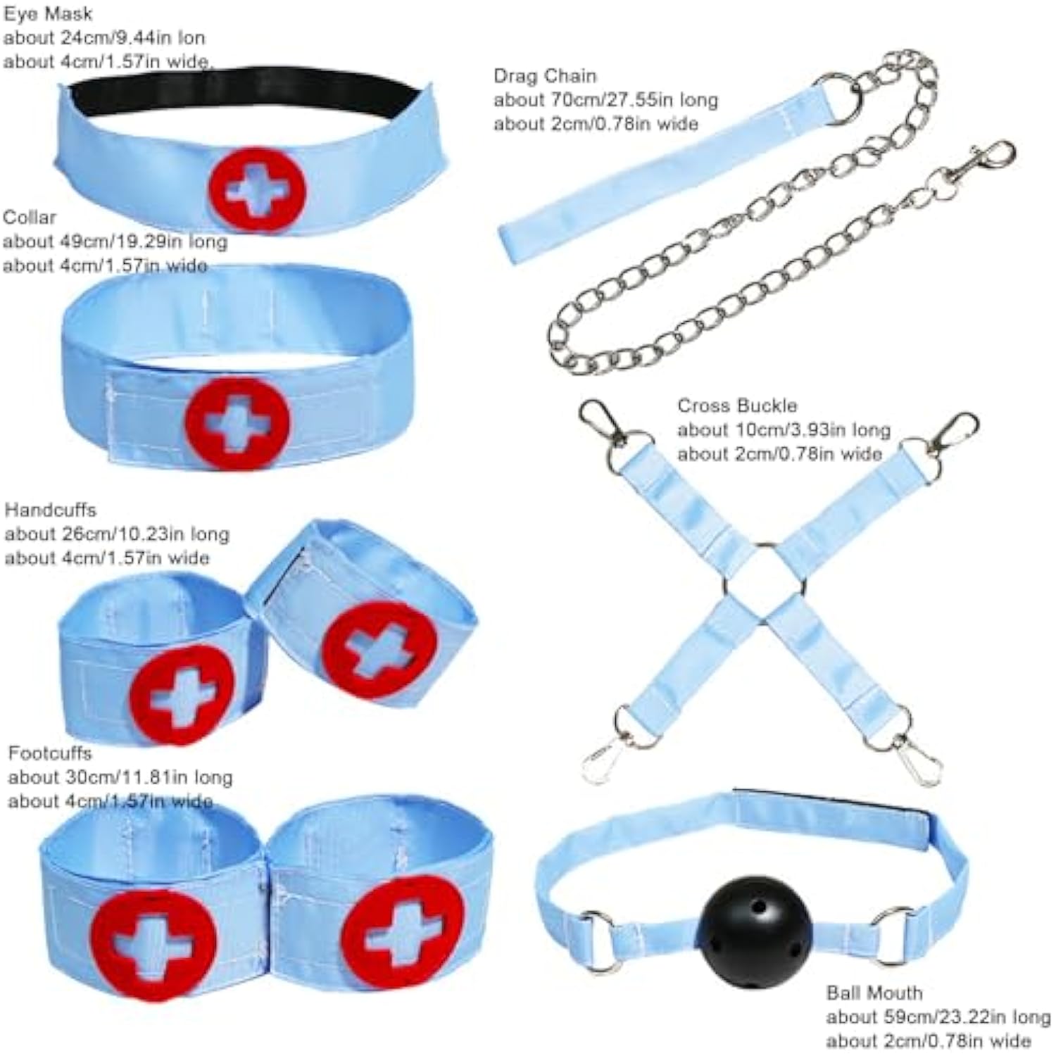 Sex Kit Nurses Restraints 7 Set Fabric Velcro Collars/Handcuffs/Ankle Cuffs/Blindfolds/Gags/Chains/Crossbuckles Bdsm Toys Gear & Accessories For Adult Couples Role Play (Pink)